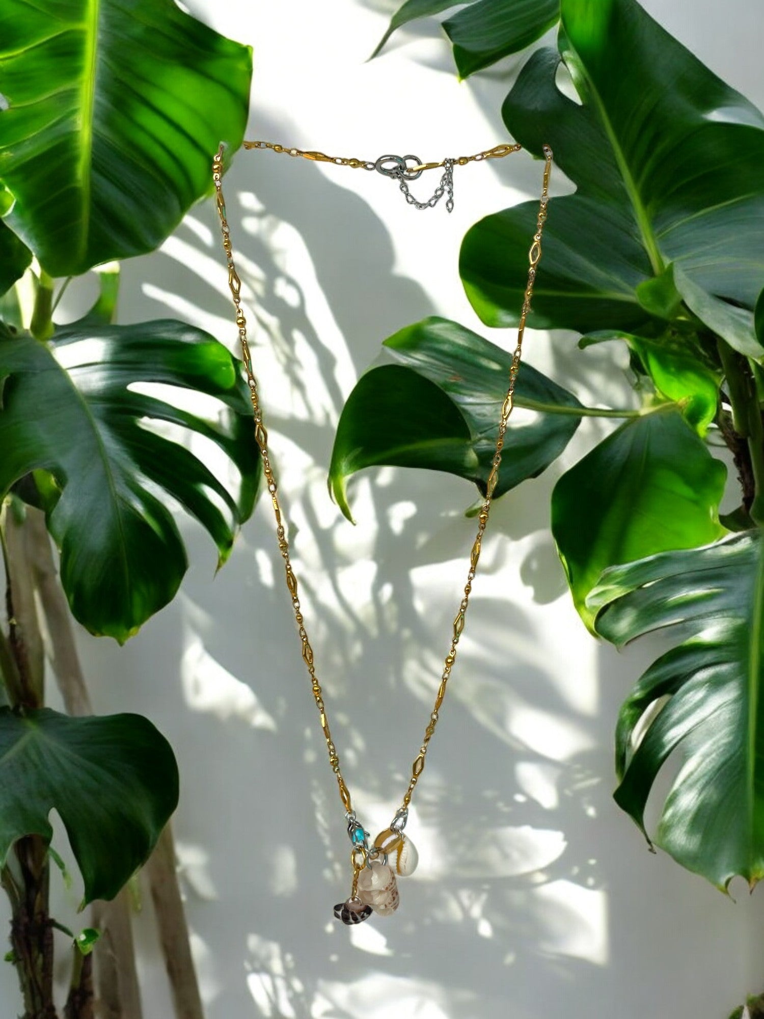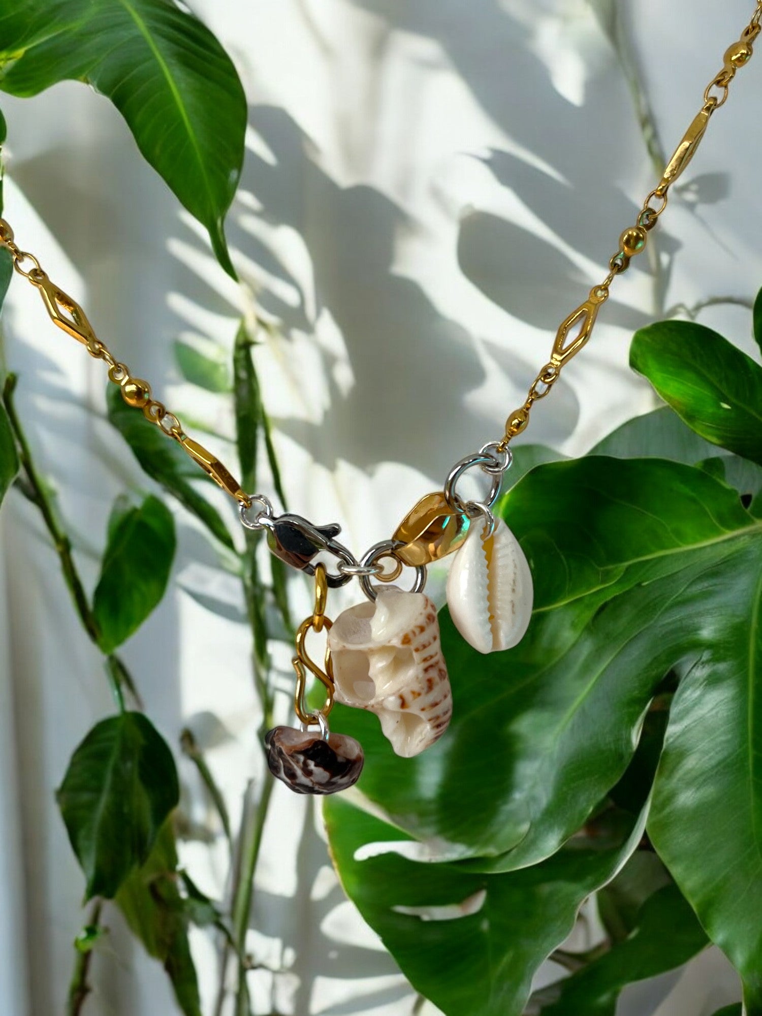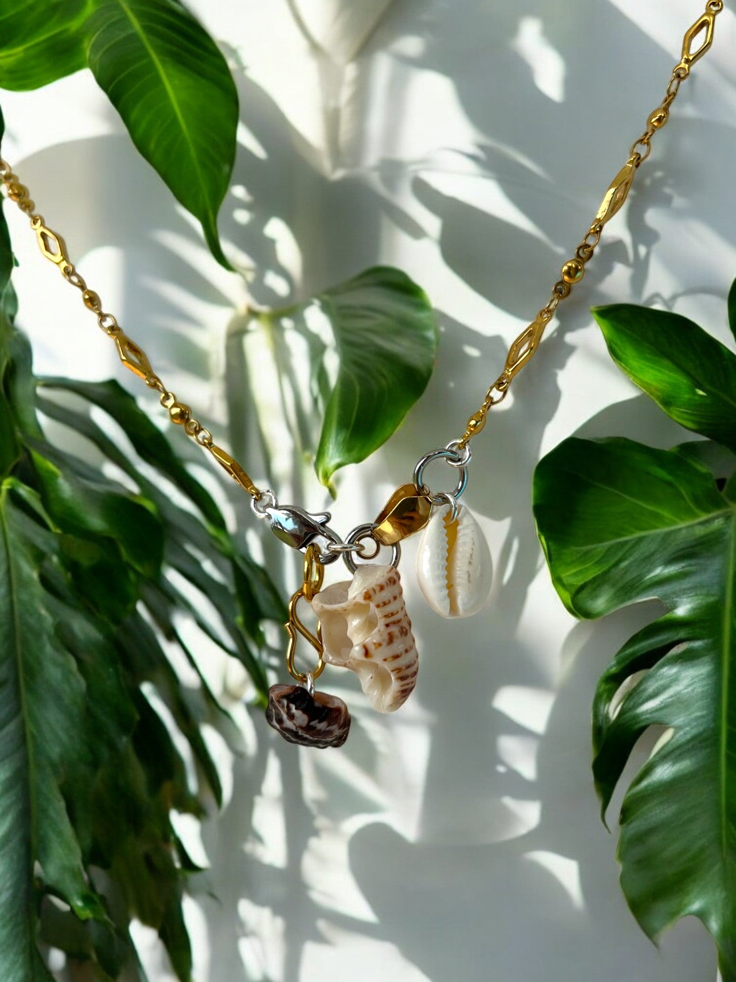 This necklace brings together three different shells, all with their own shapes and textures, hanging from a bold gold mixed-link chain. No two are the same making it unique.
