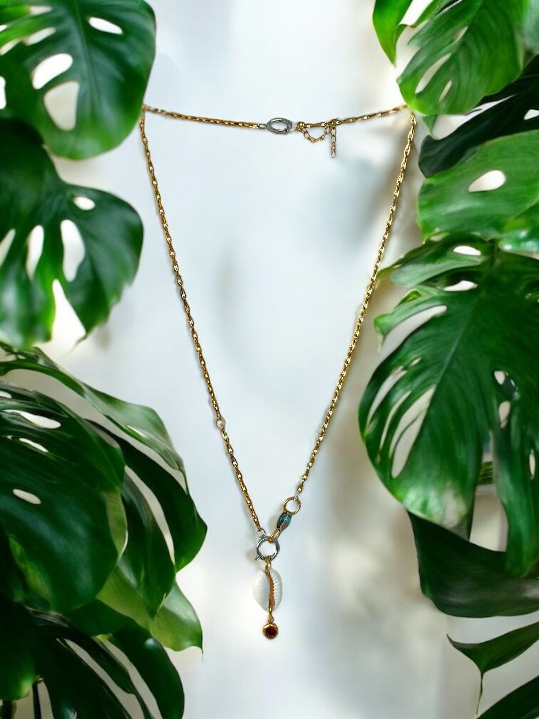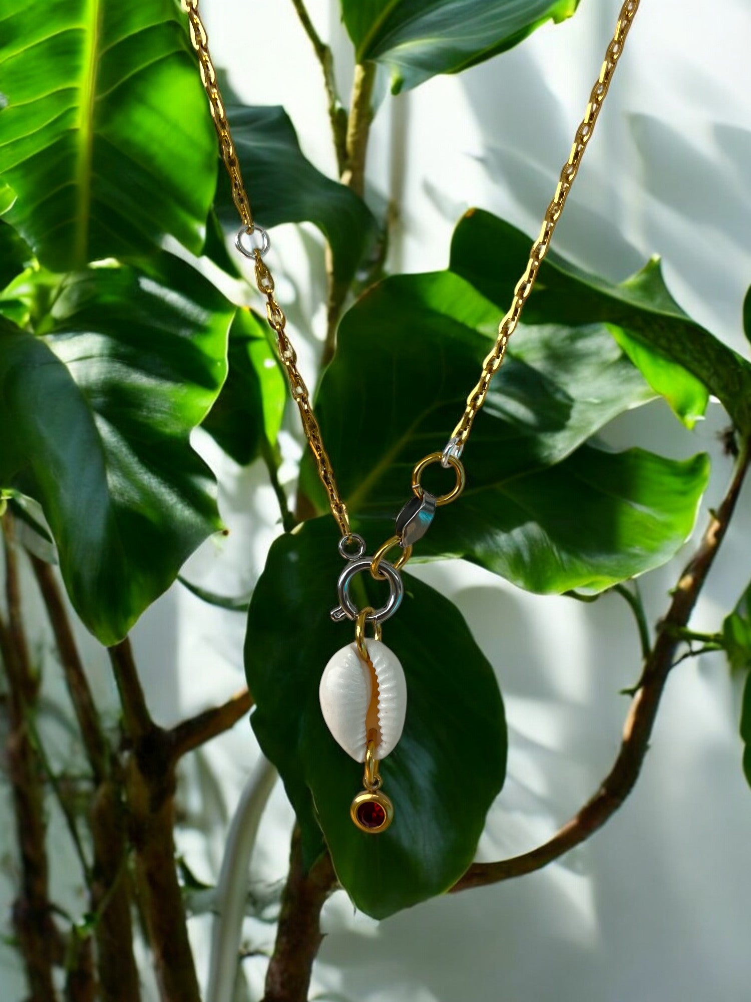 This necklace keeps that grounded energy — a cowrie shell paired with a warm red charm, hanging from a two-tone gold and silver chain. It’s simple but full of texture.