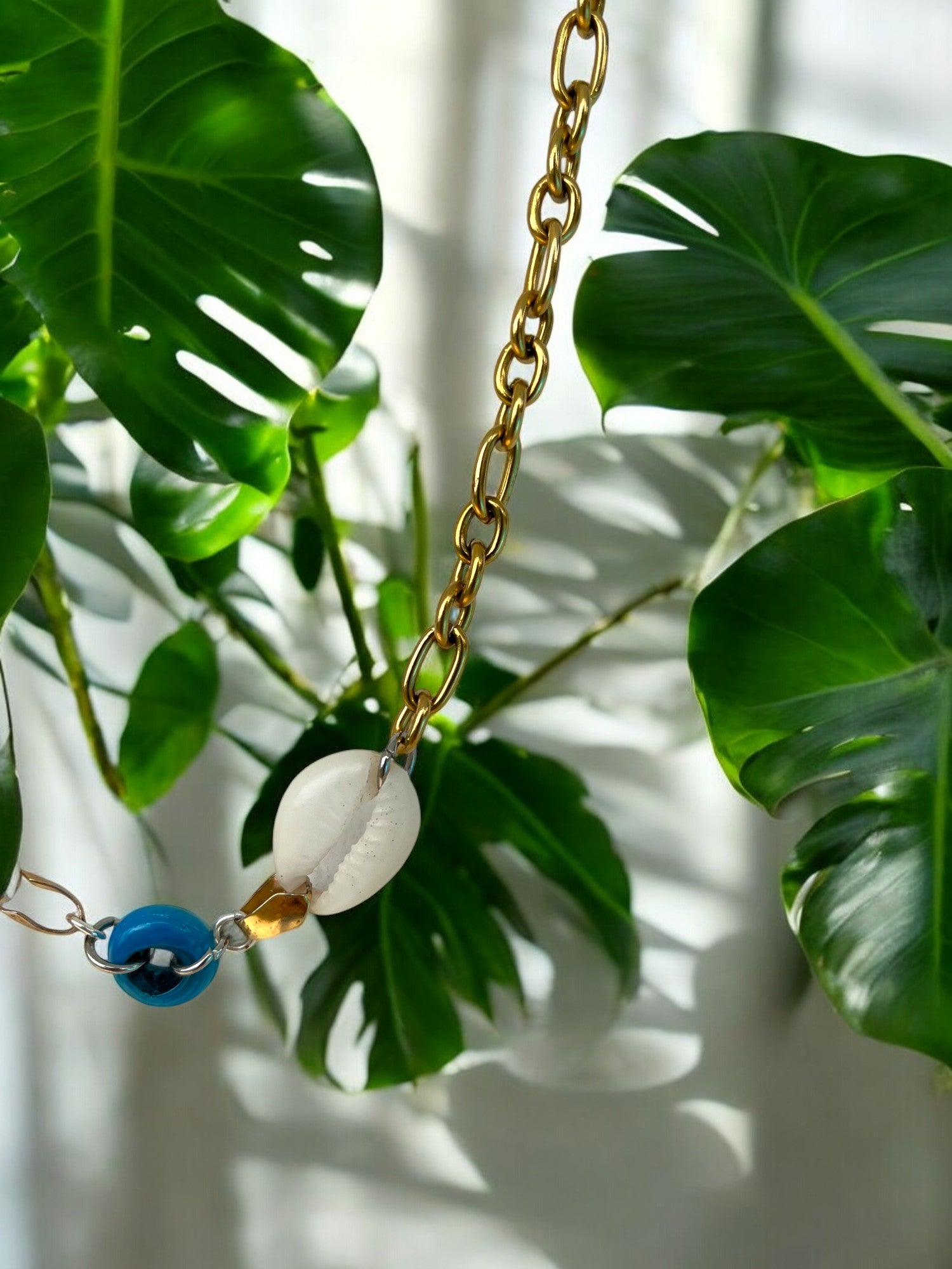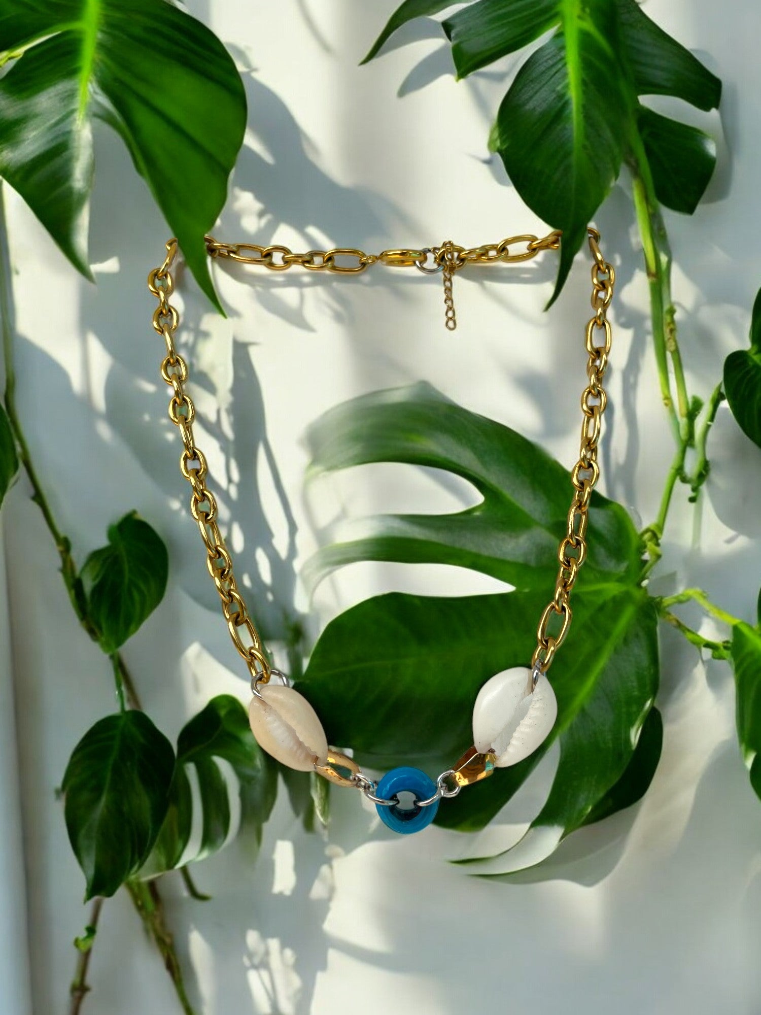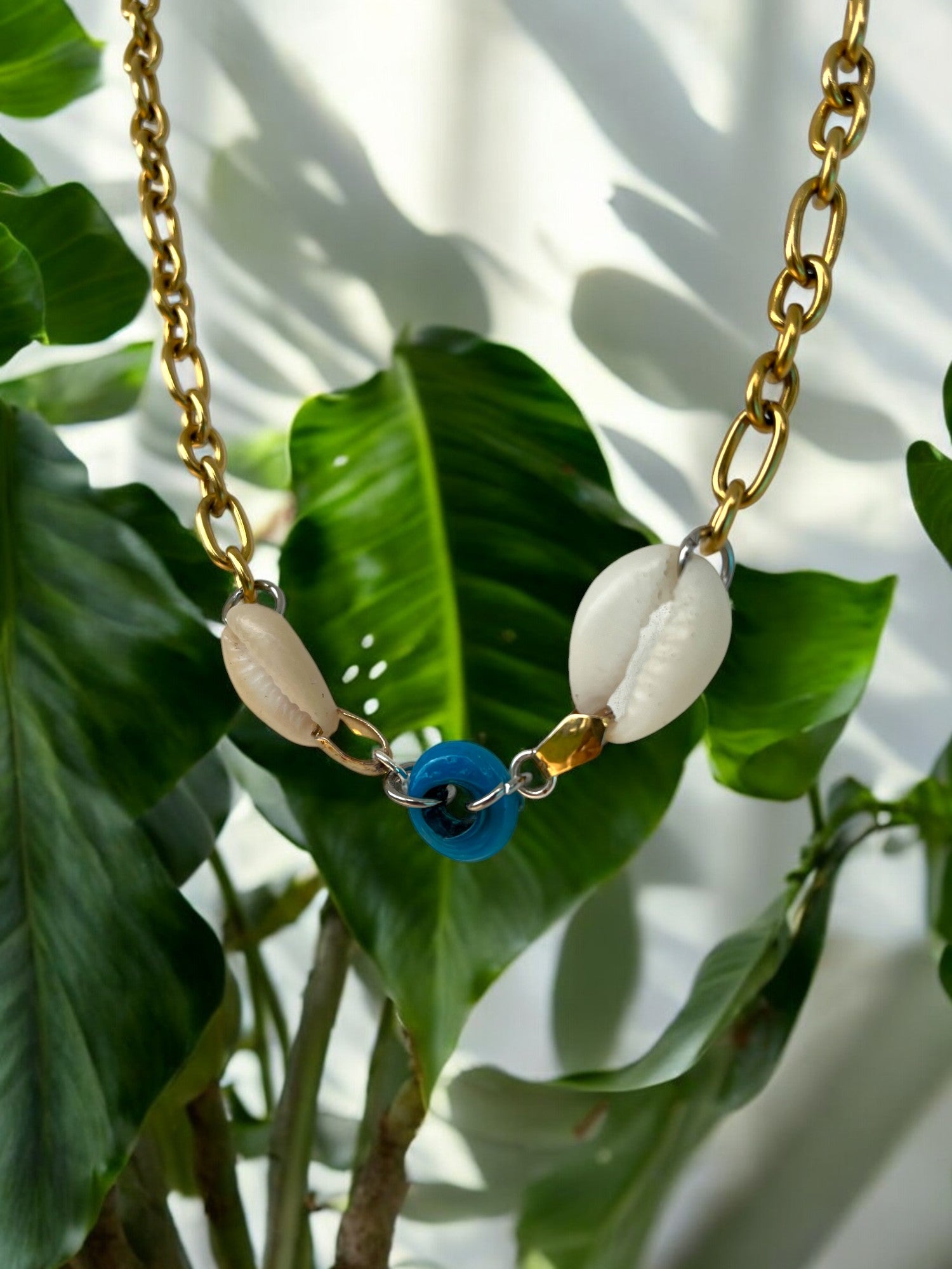 This necklace is simple but bold, with two cowrie shells and a bright blue glass bead right at the center. It’s got that sun + sea + surf energy that feels instantly good on the skin.
