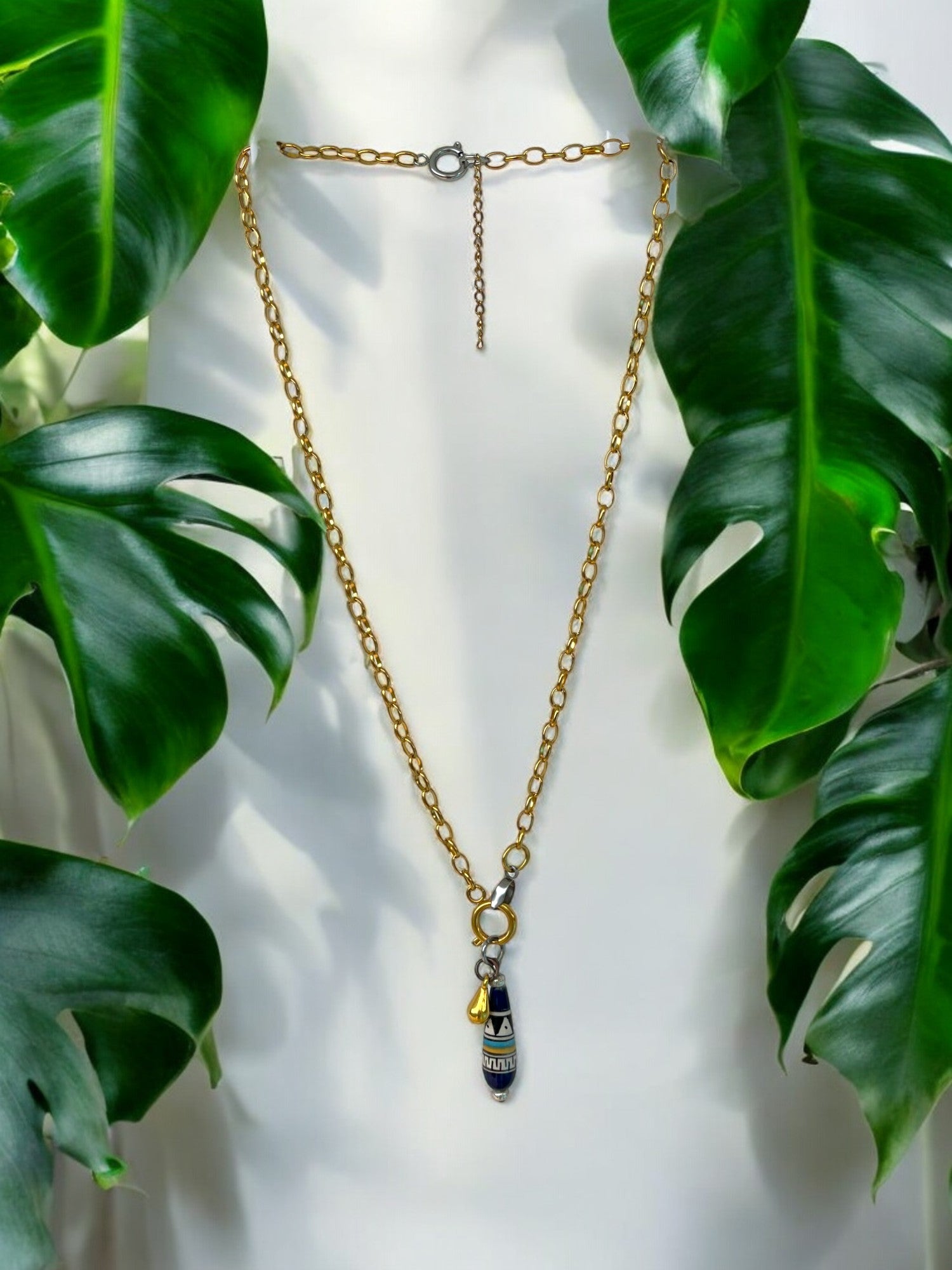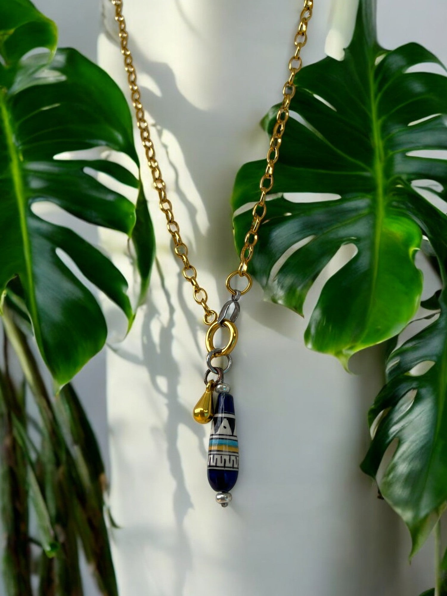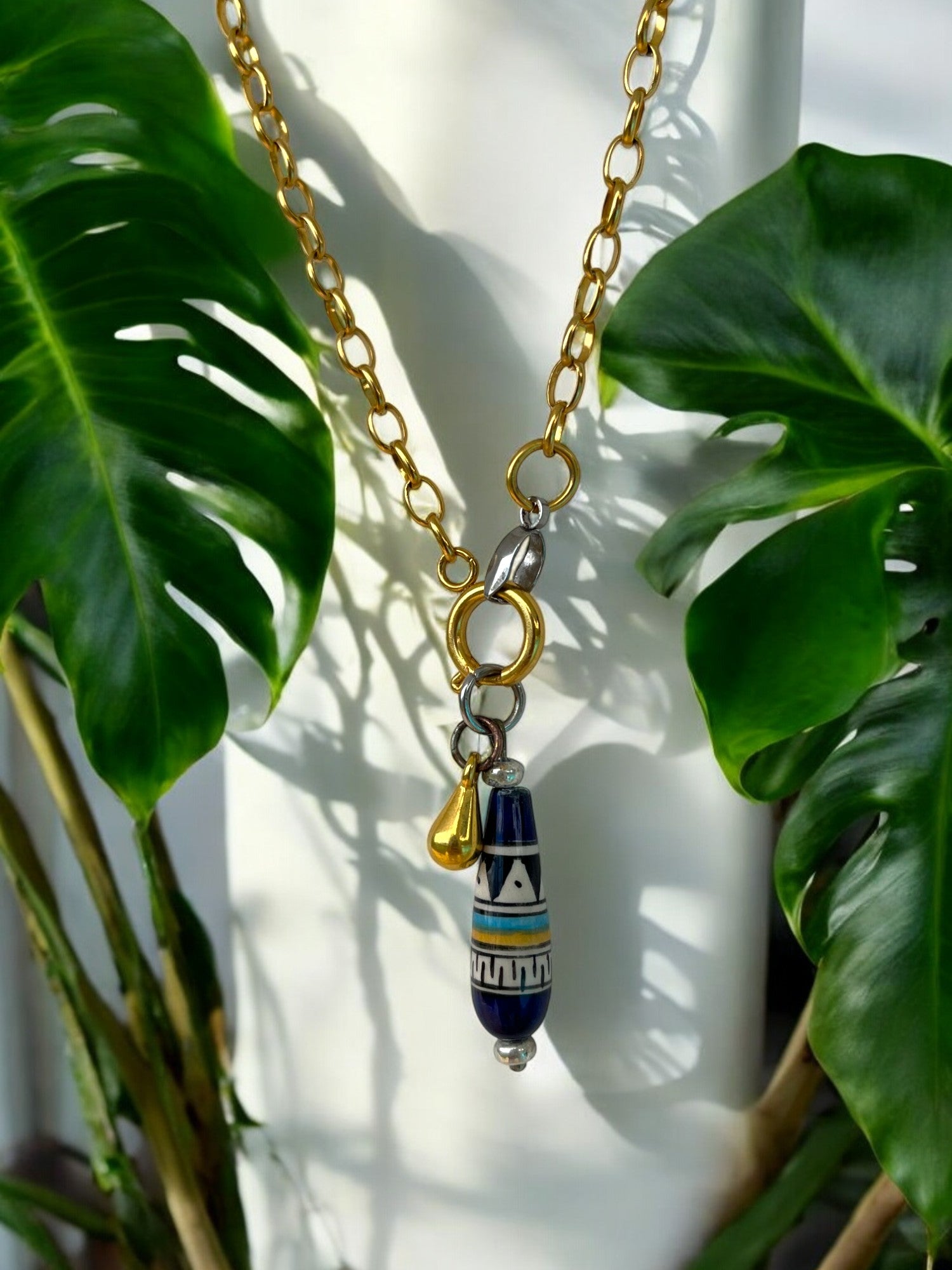 This necklace features a hand-painted bead with subtle tribal detail and a tiny golden drop charm, like a little echo of falling water. It’s a piece that stands out without trying too hard.