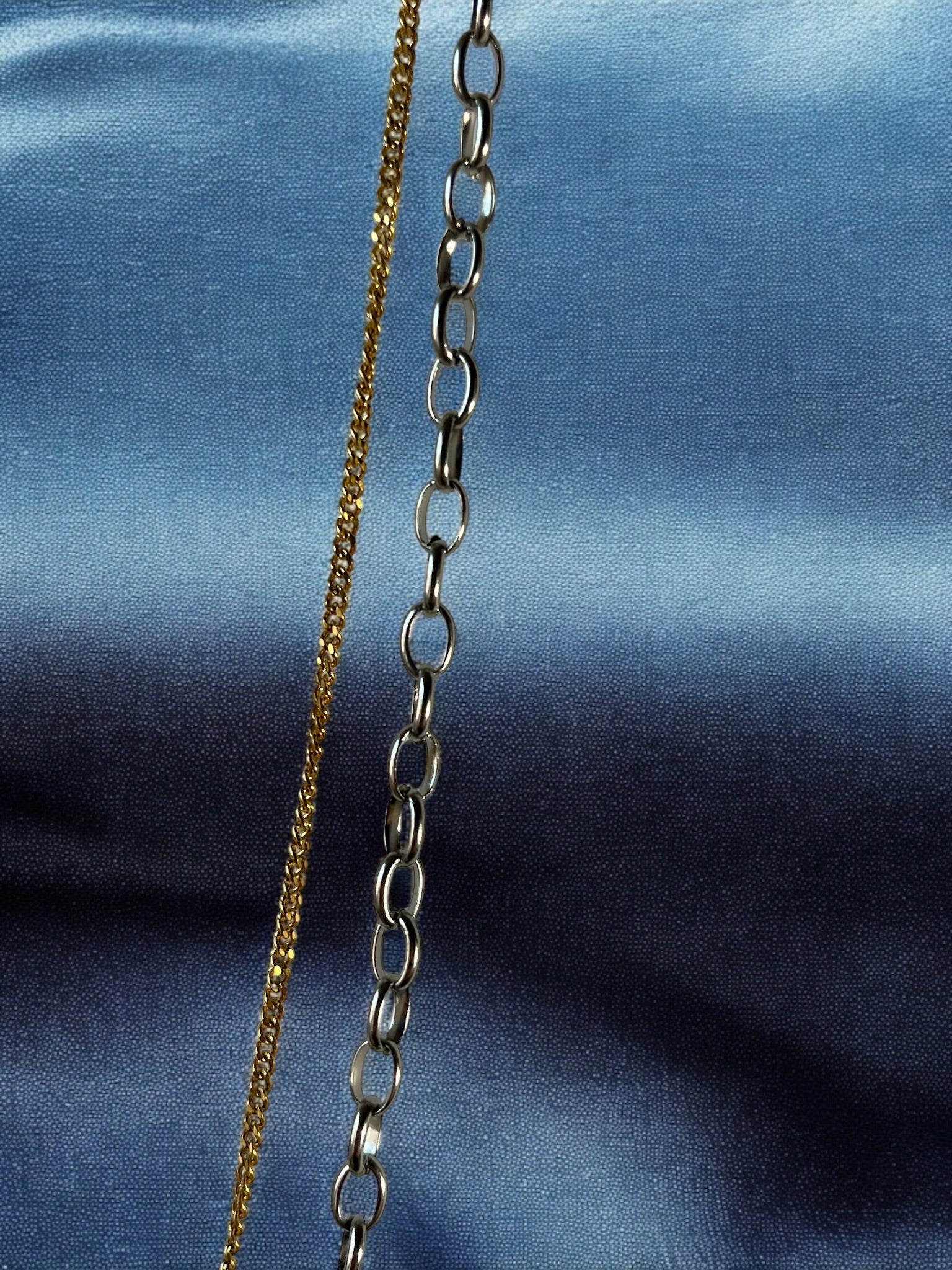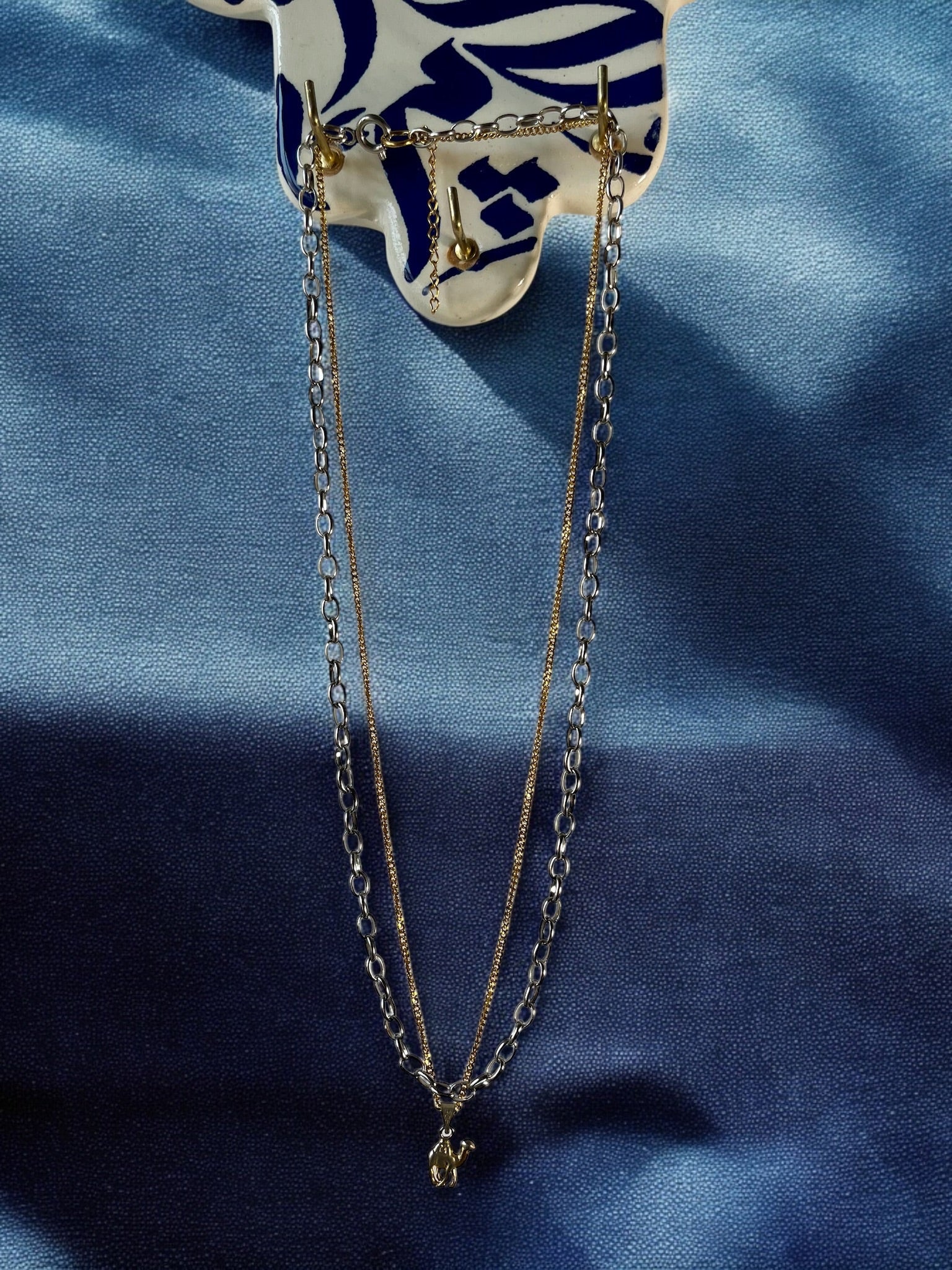 This mid-length necklace is crafted with a double chain—one in silver and one in gold stainless steel—creating a stunning contrast. To add a playful and unique touch, I’ve included a cute camel charm made out of silver that can move freely along the chain, adding a sense of movement and charm to the design.