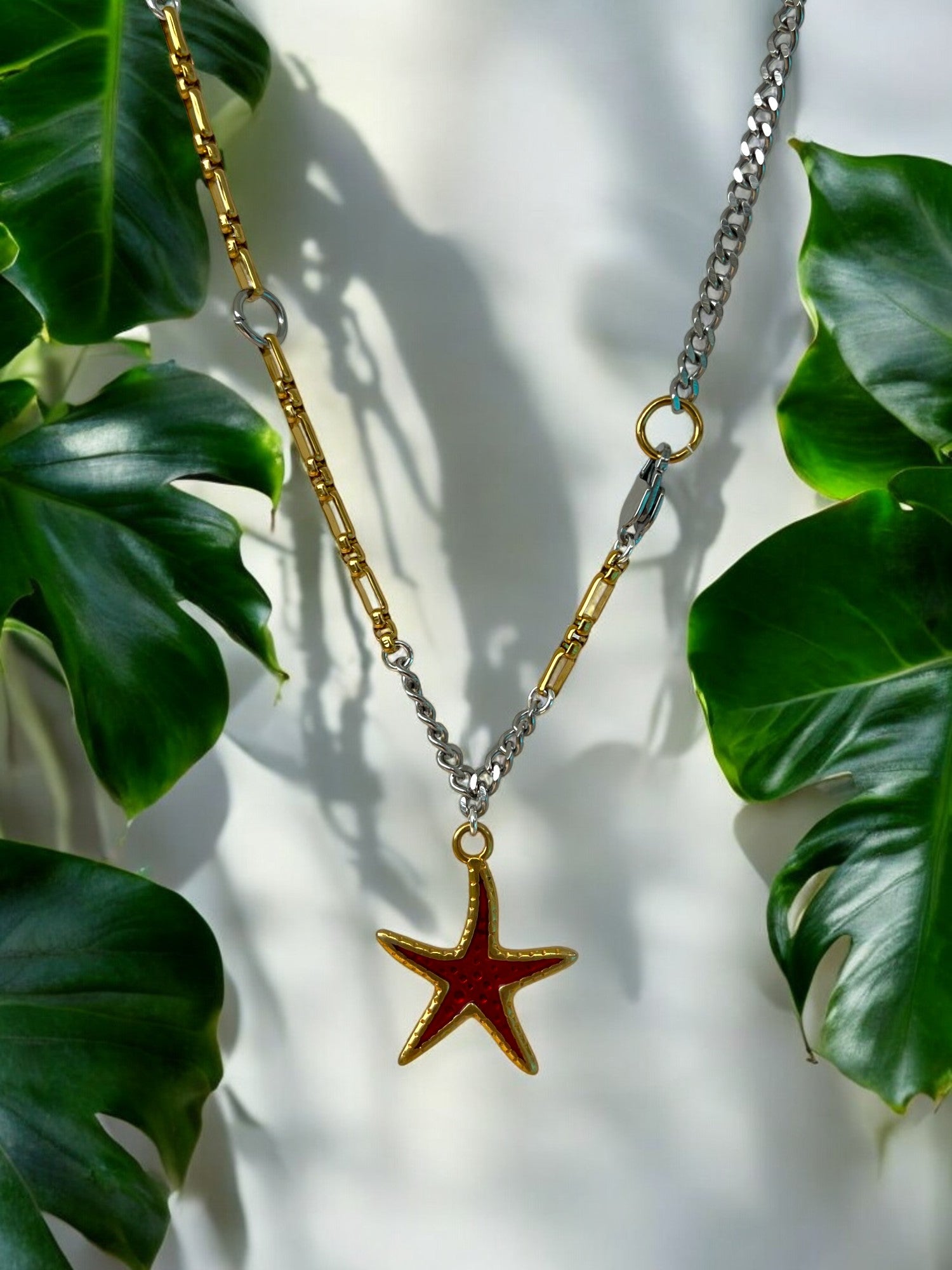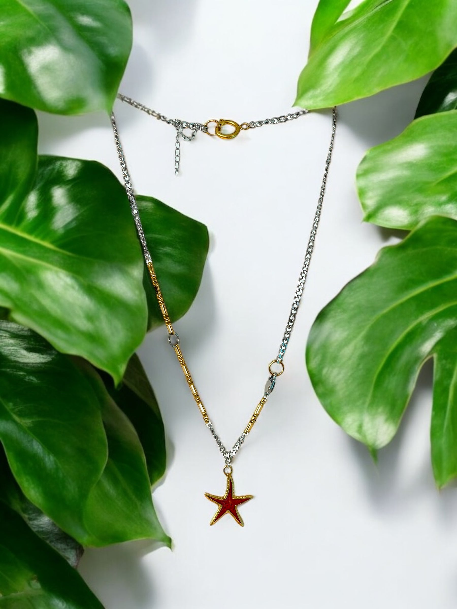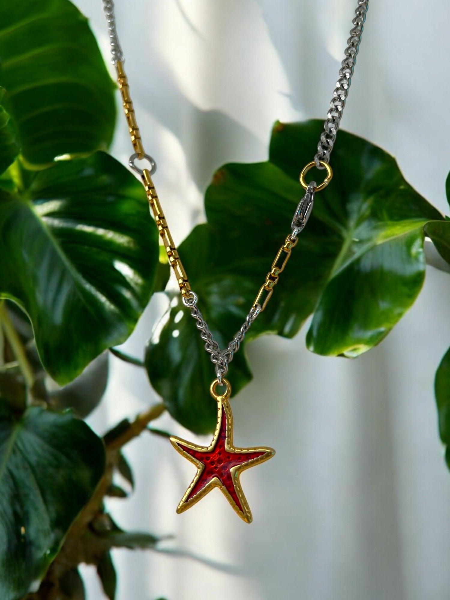 This necklace features a bold red starfish charm on a mixed silver and gold chain, giving it a beachy feel with a bit of contrast. It’s playful but still polished, like something you'd throw on after a dip in the sea and wear straight to dinner.