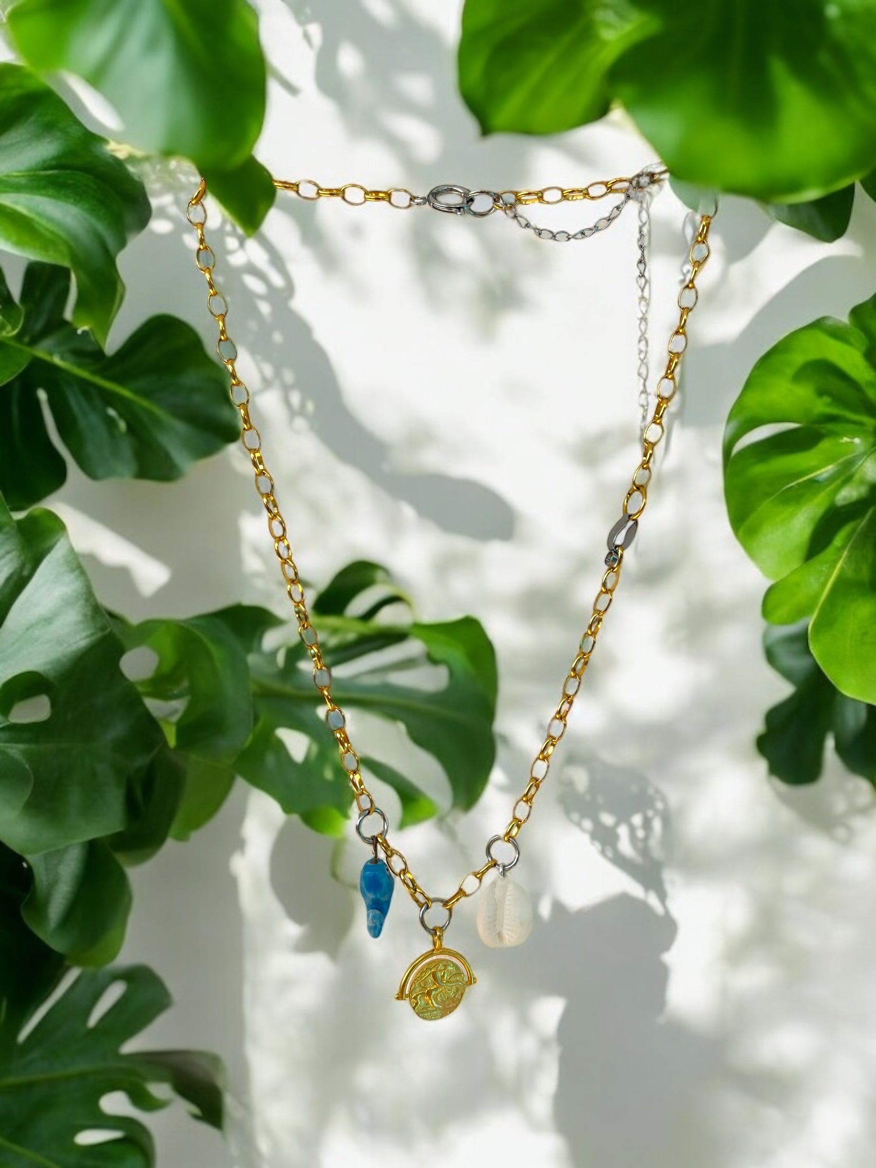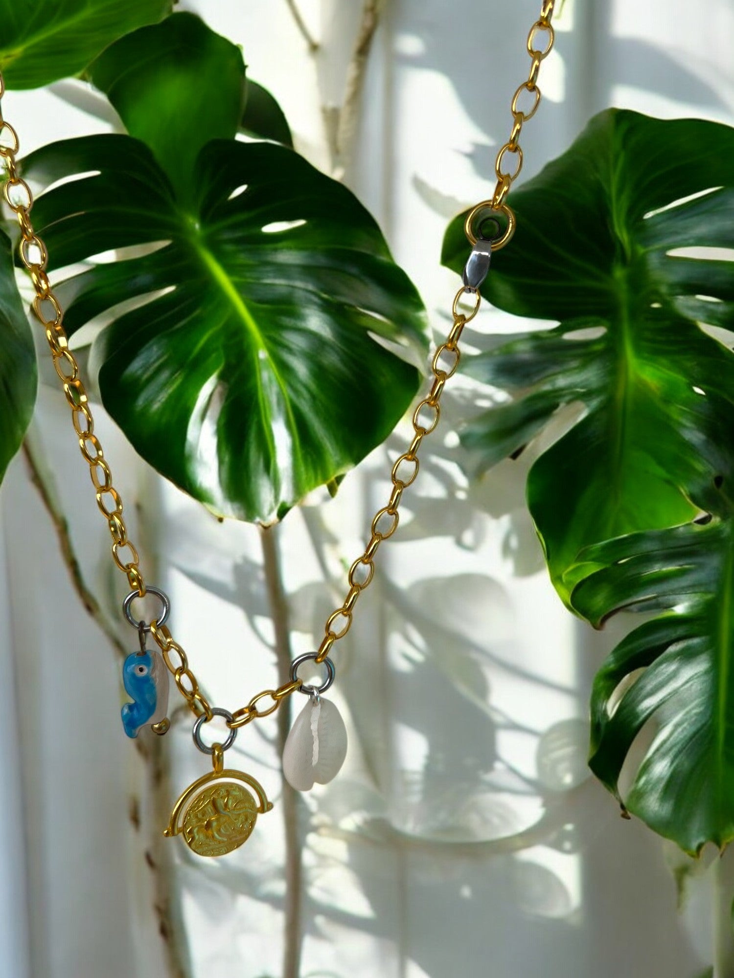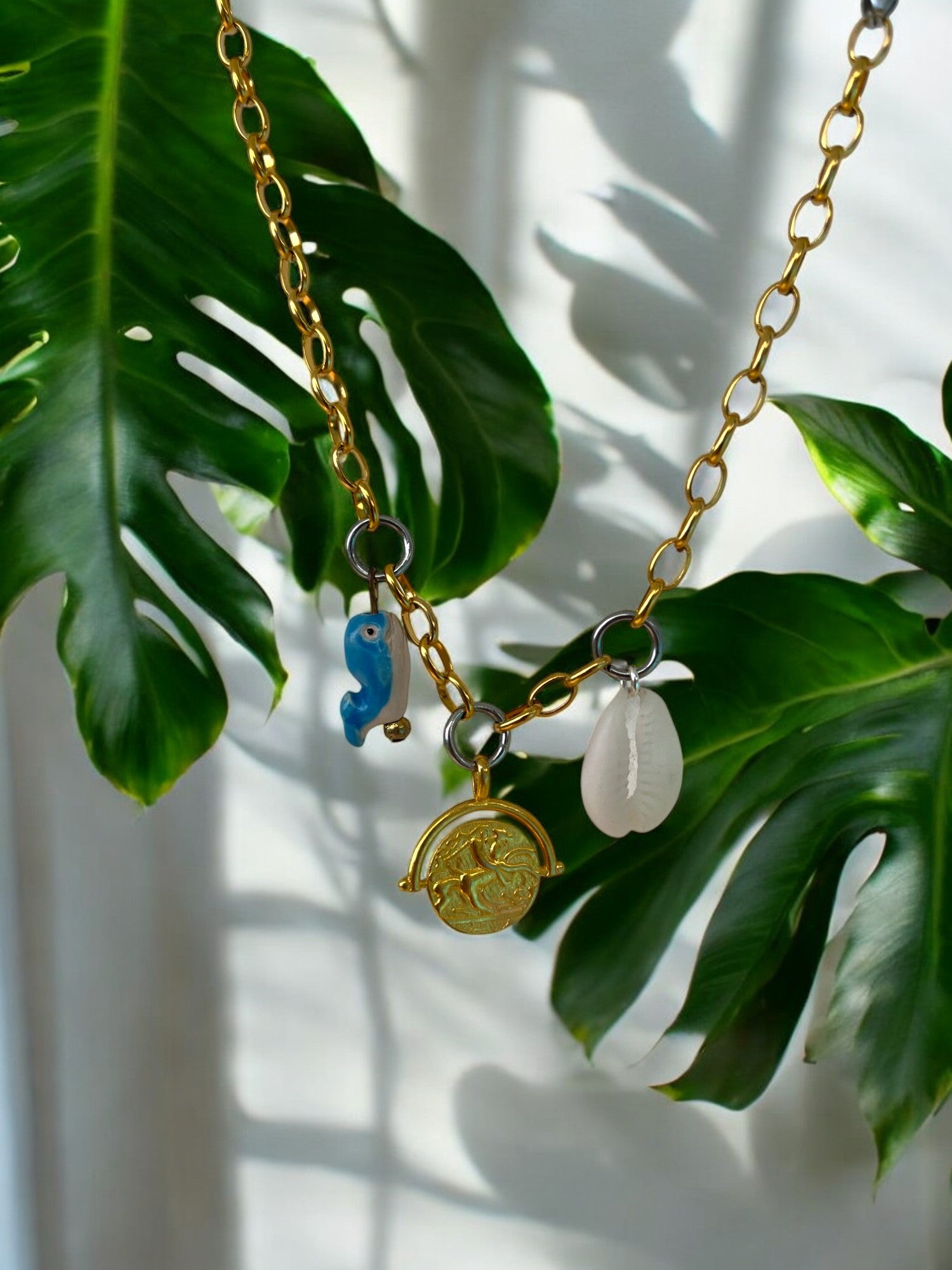 This necklace mixes a cowrie shell, a playful seahorse charm, and a golden medallion, all on a chunky gold chain. It feels fun and a little nostalgic, like collecting little treasures from a day spent by the water.