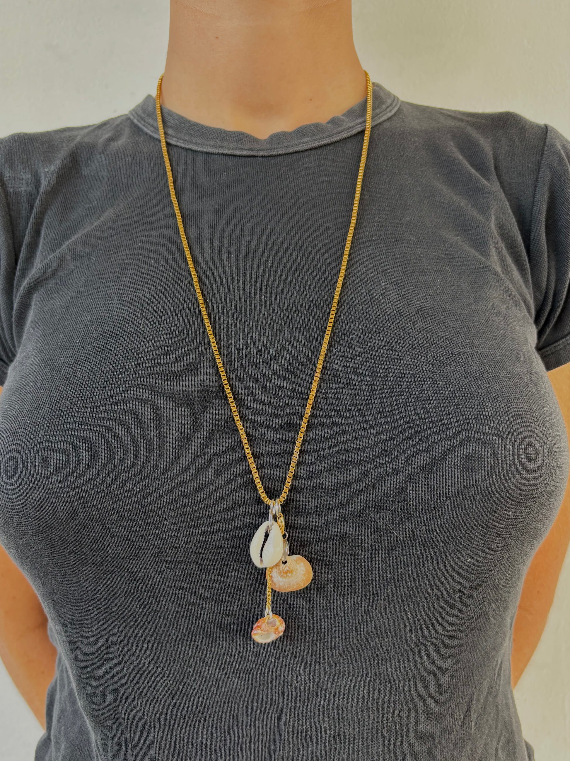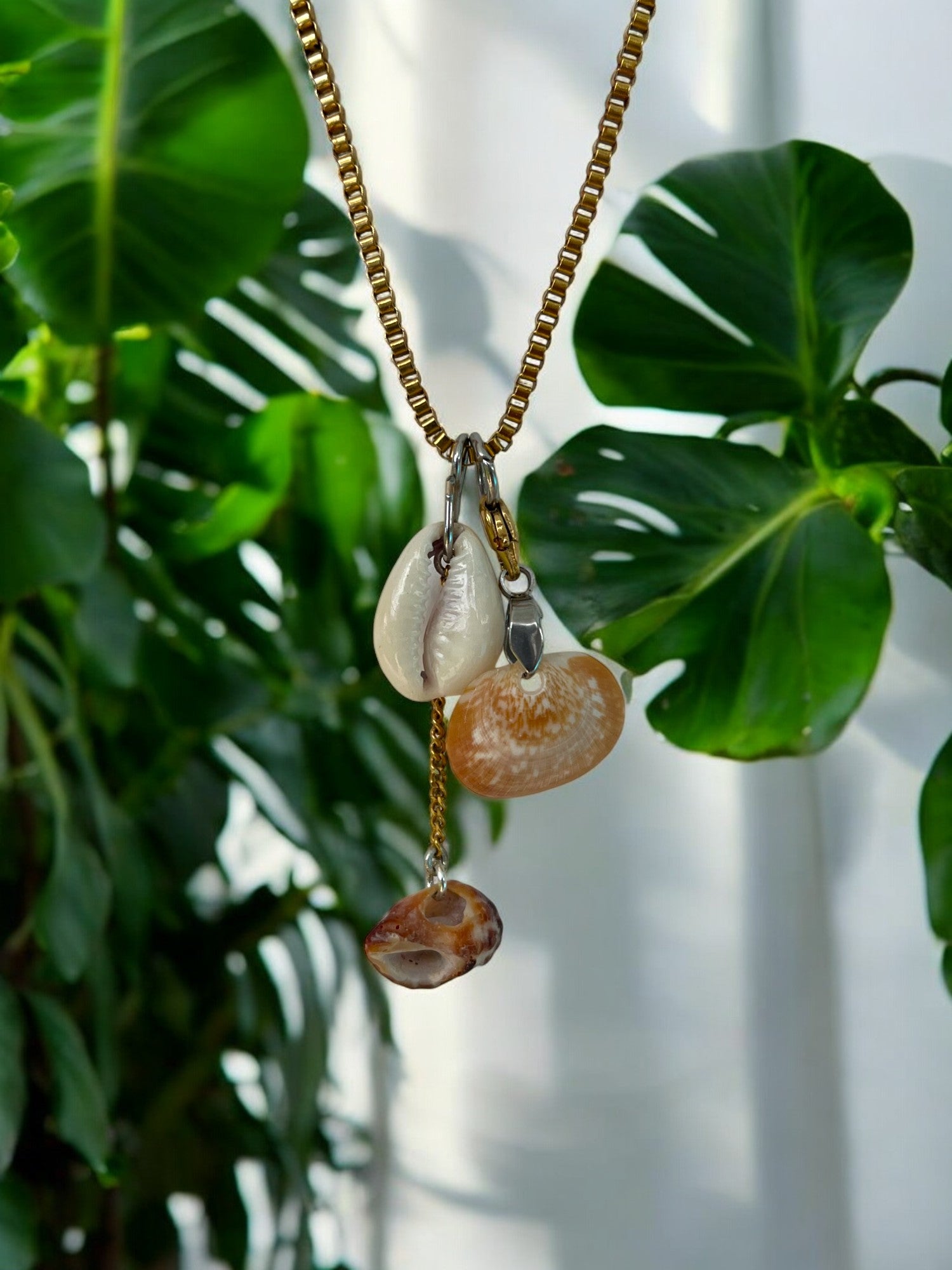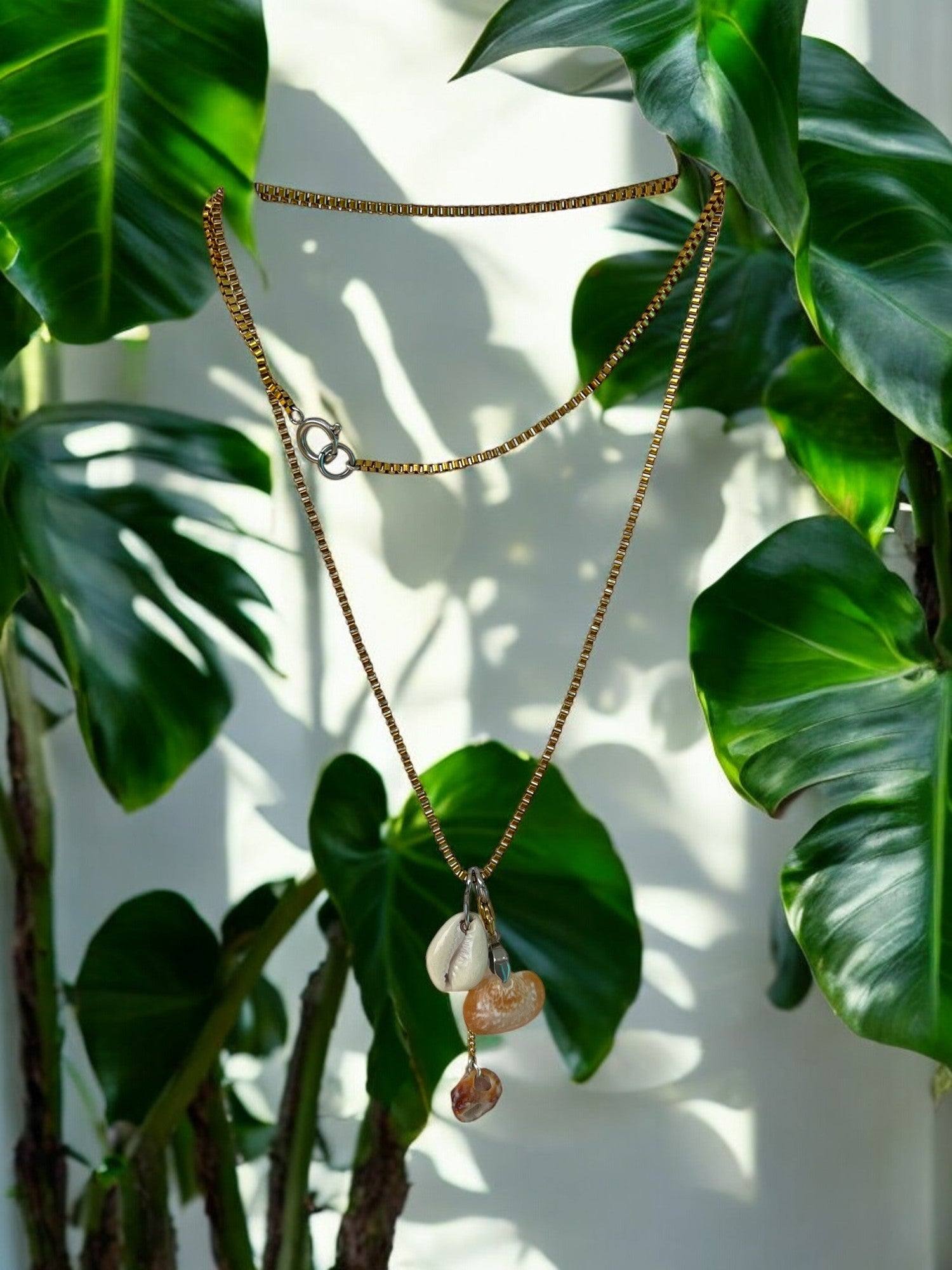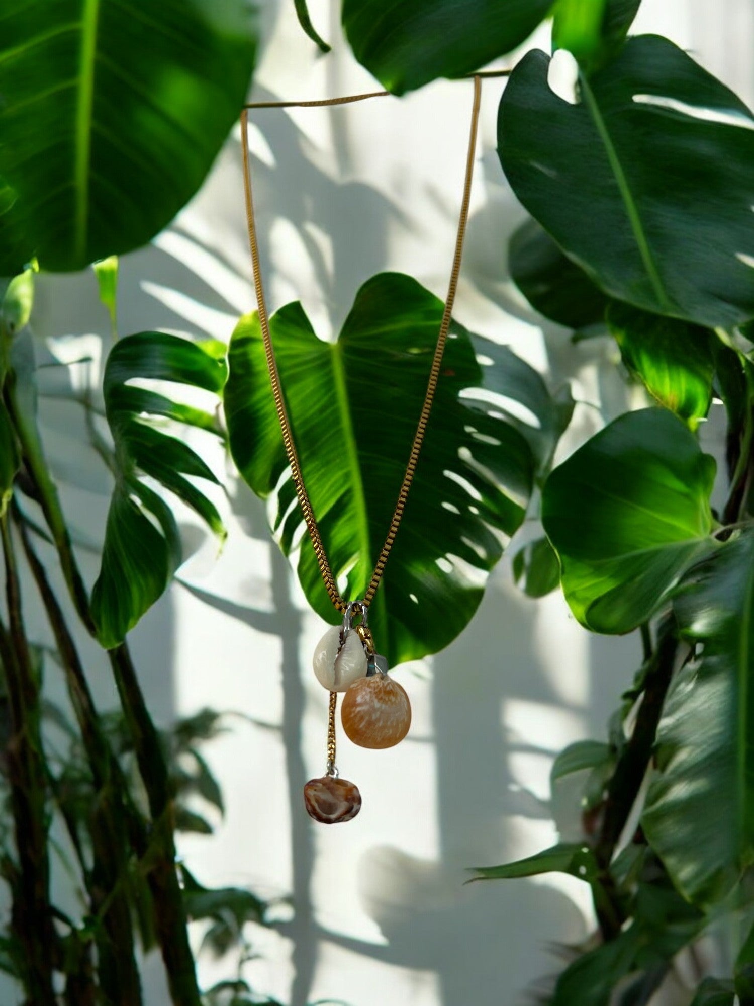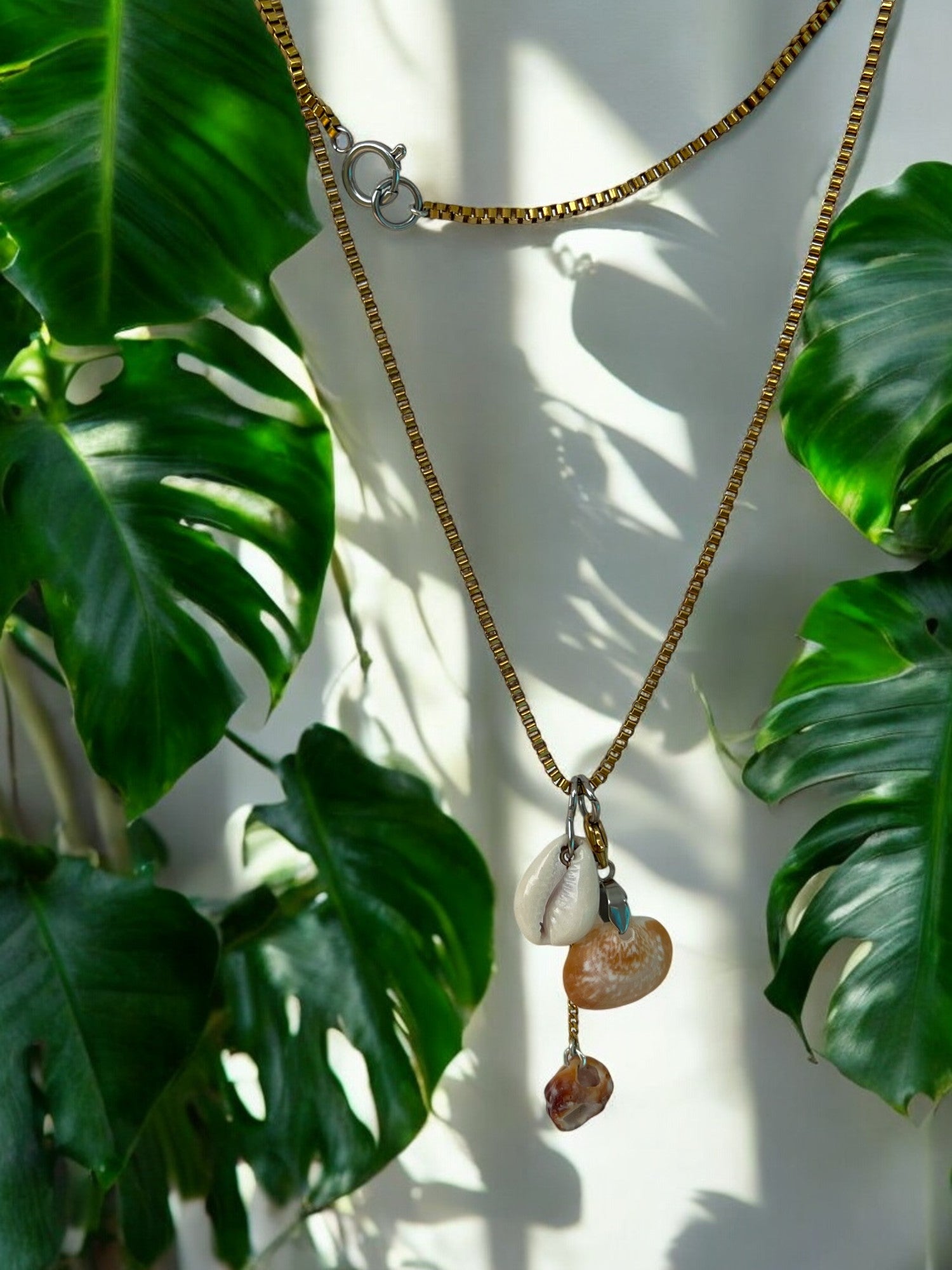 This necklace brings together three natural elements — each one different, but all softened by time and tide. Hung on a bold gold chain, it feels raw but intentional, like something you found on a walk and never took off.