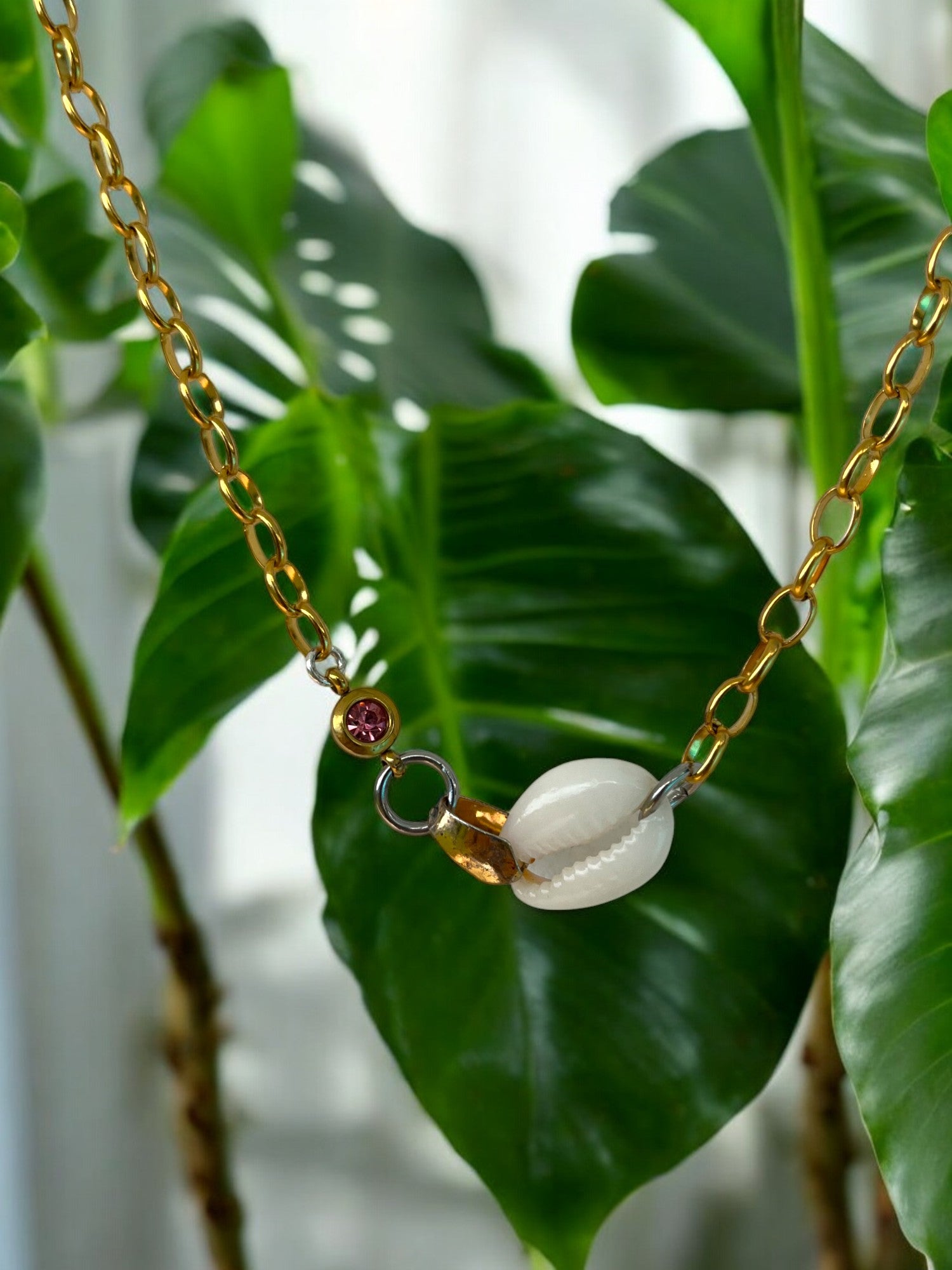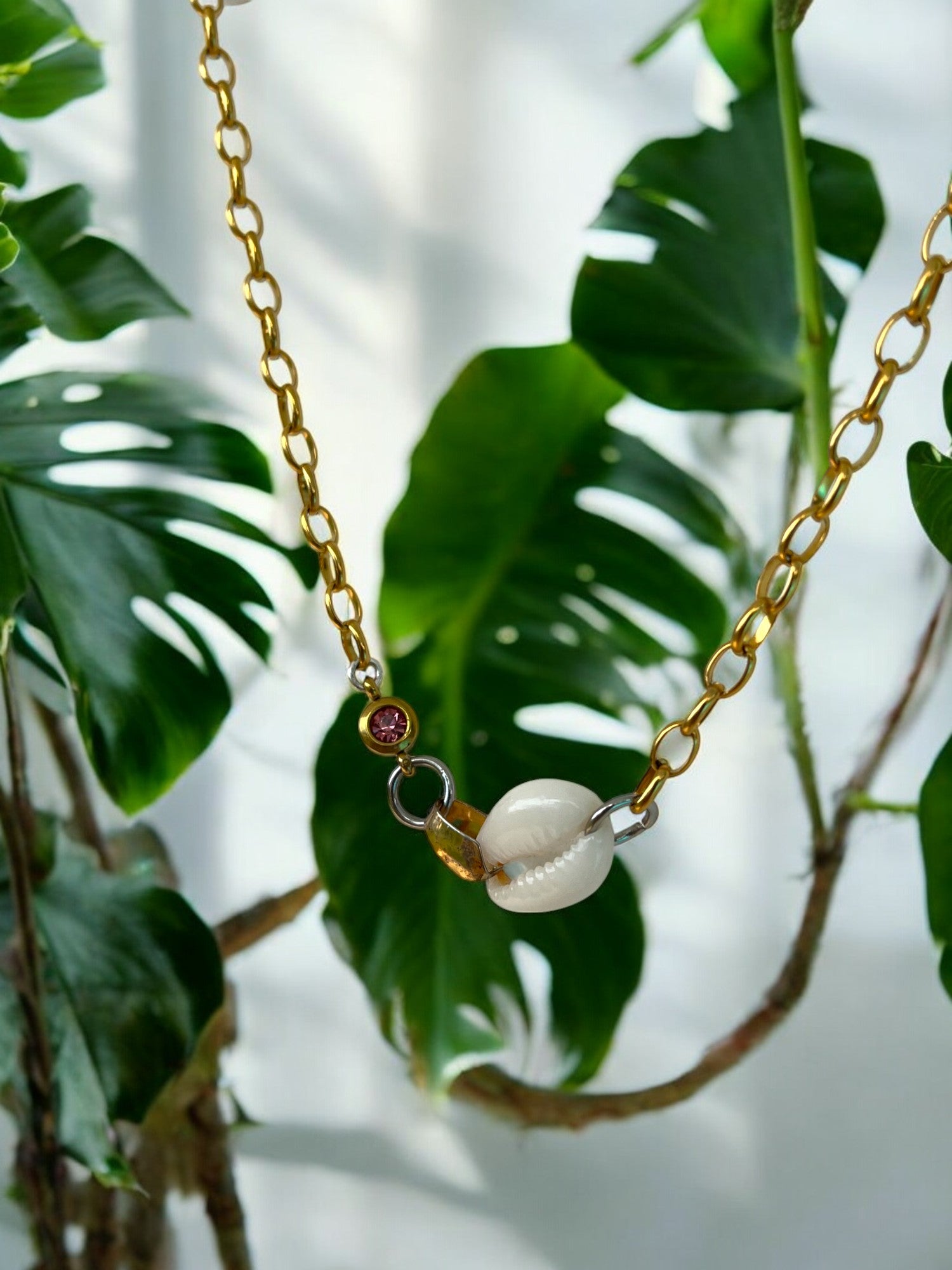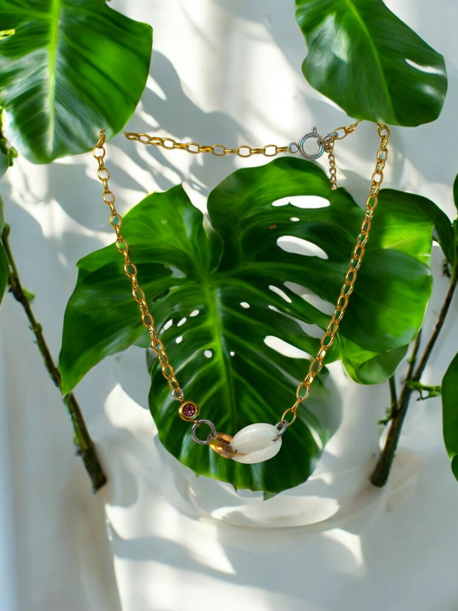 This necklace is slightly shorter in length, making it perfect for layering. It features a cowrie shell, warm gold chain, and two small gemstone accents — simple details that bring the whole piece to life.