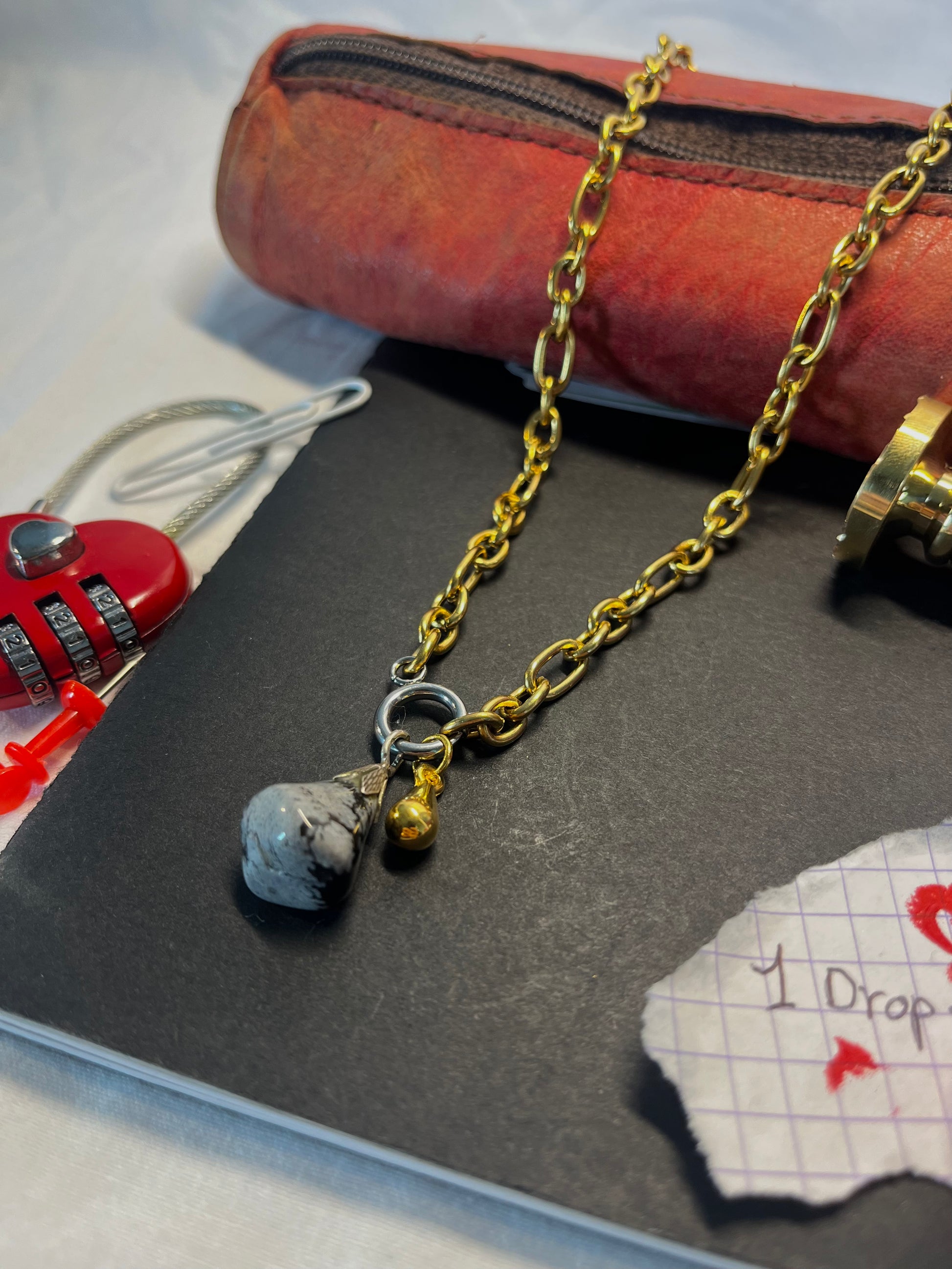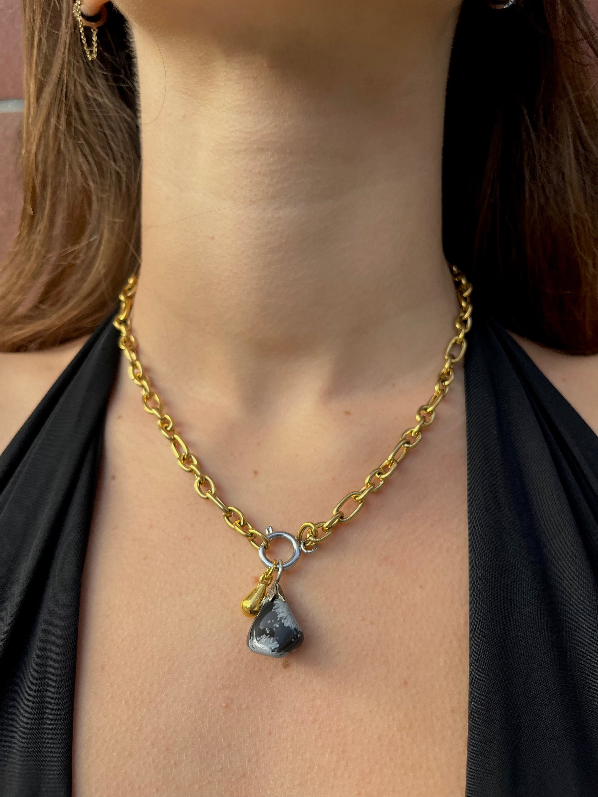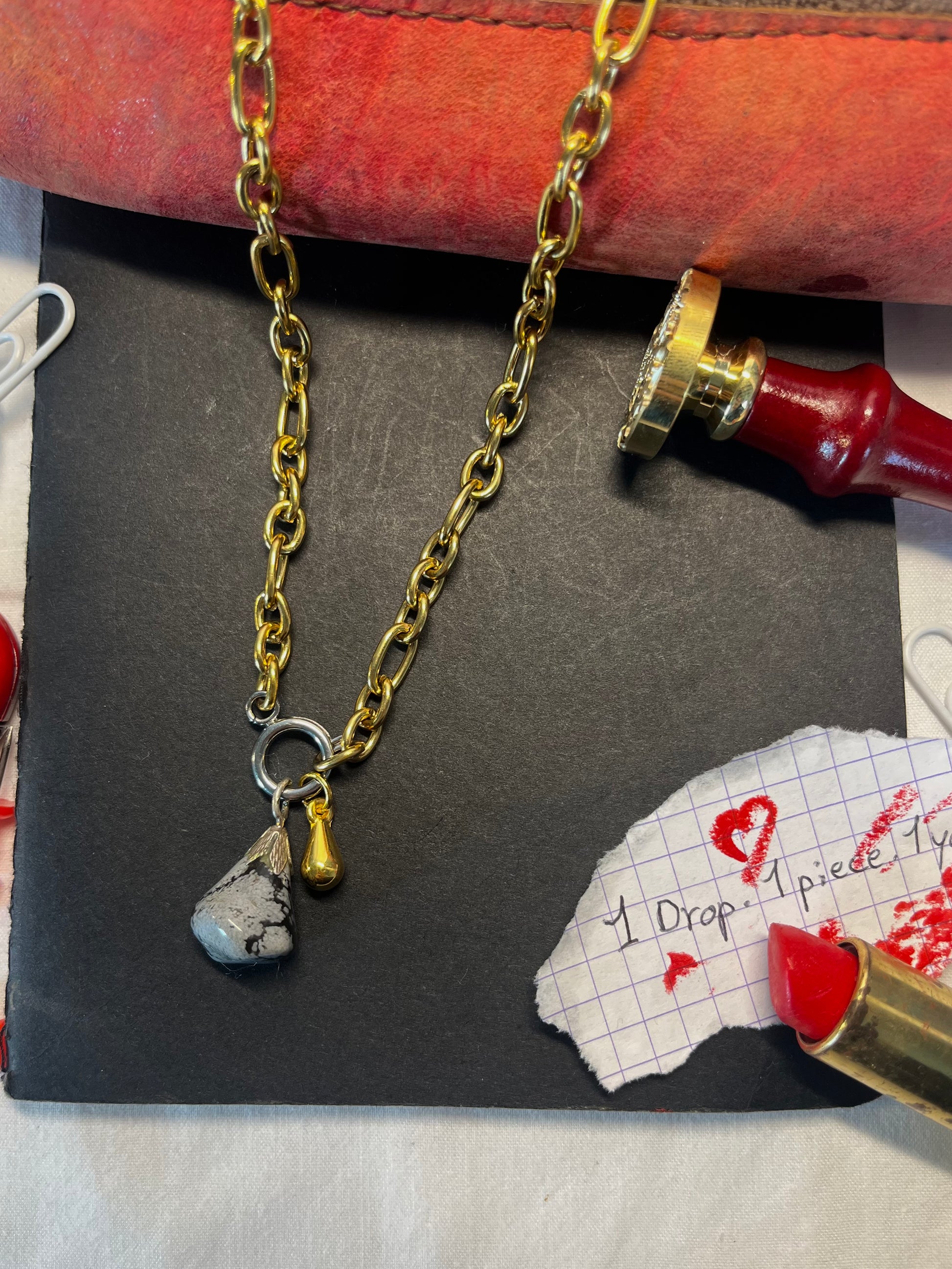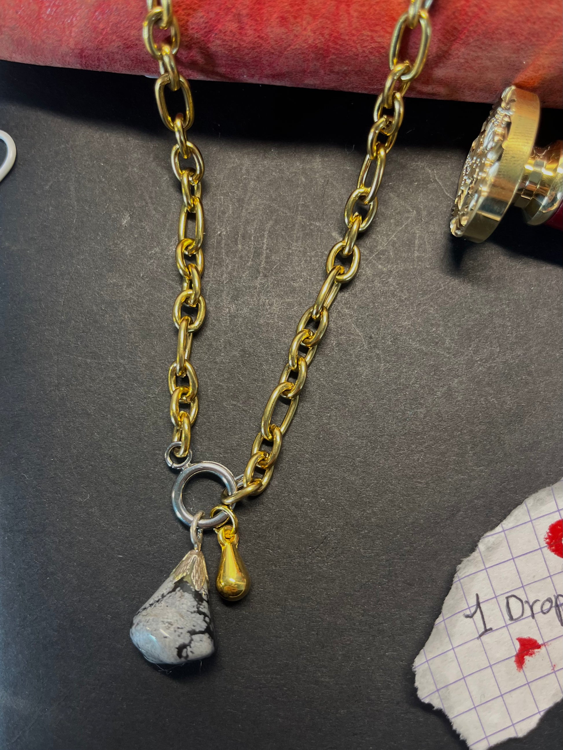 The pendant features two teardrop-shaped pieces: one large stone with marbling detail, and the other a smaller, full gold teardrop. The combination of the two shapes creates a striking contrast, adding depth and texture to the design. This necklace is unisex, making it perfect for both men and women. Both the chain and pendant are crafted from stainless steel, ensuring they are tarnish-proof and waterproof, making them durable and built to last.