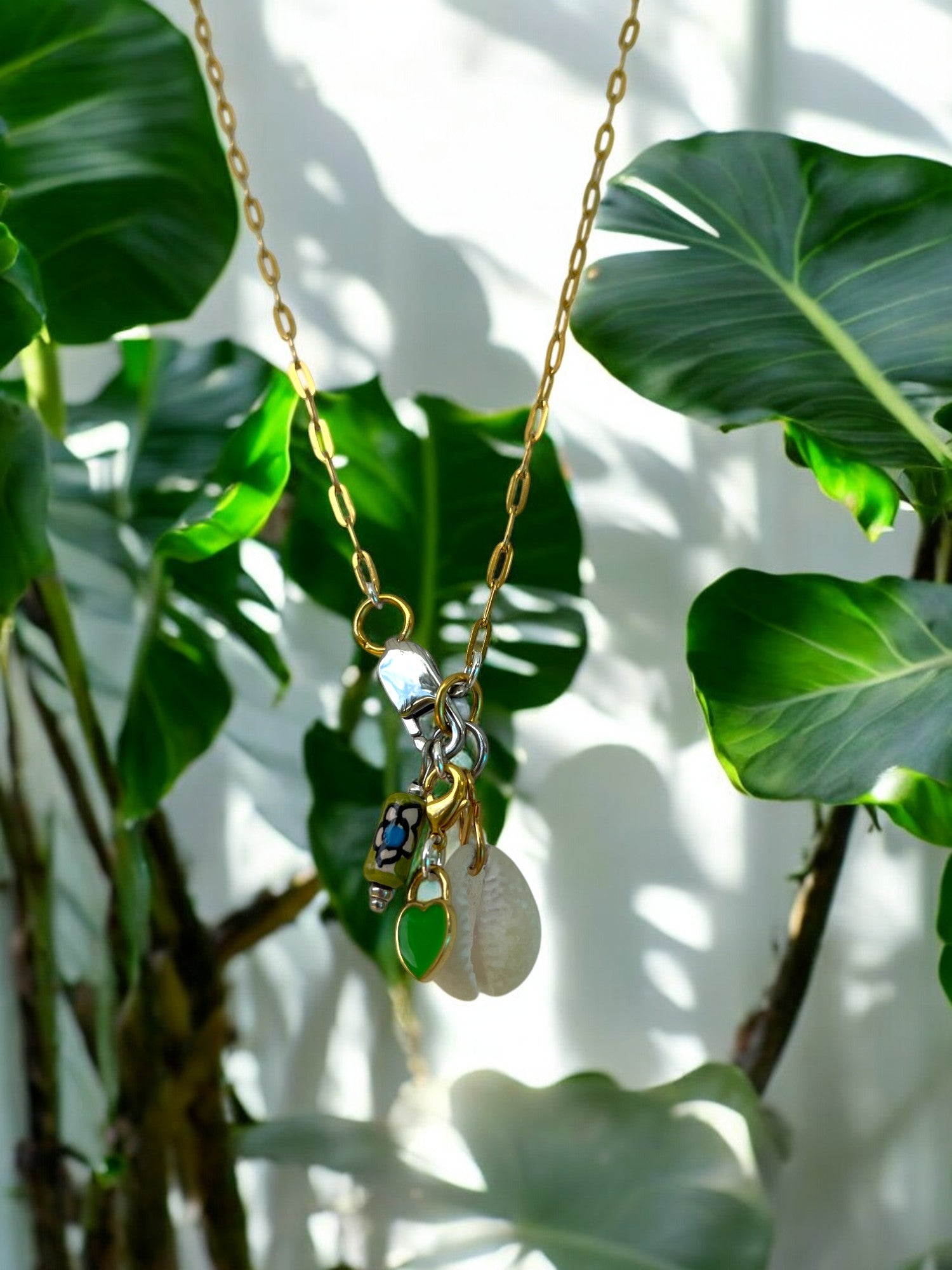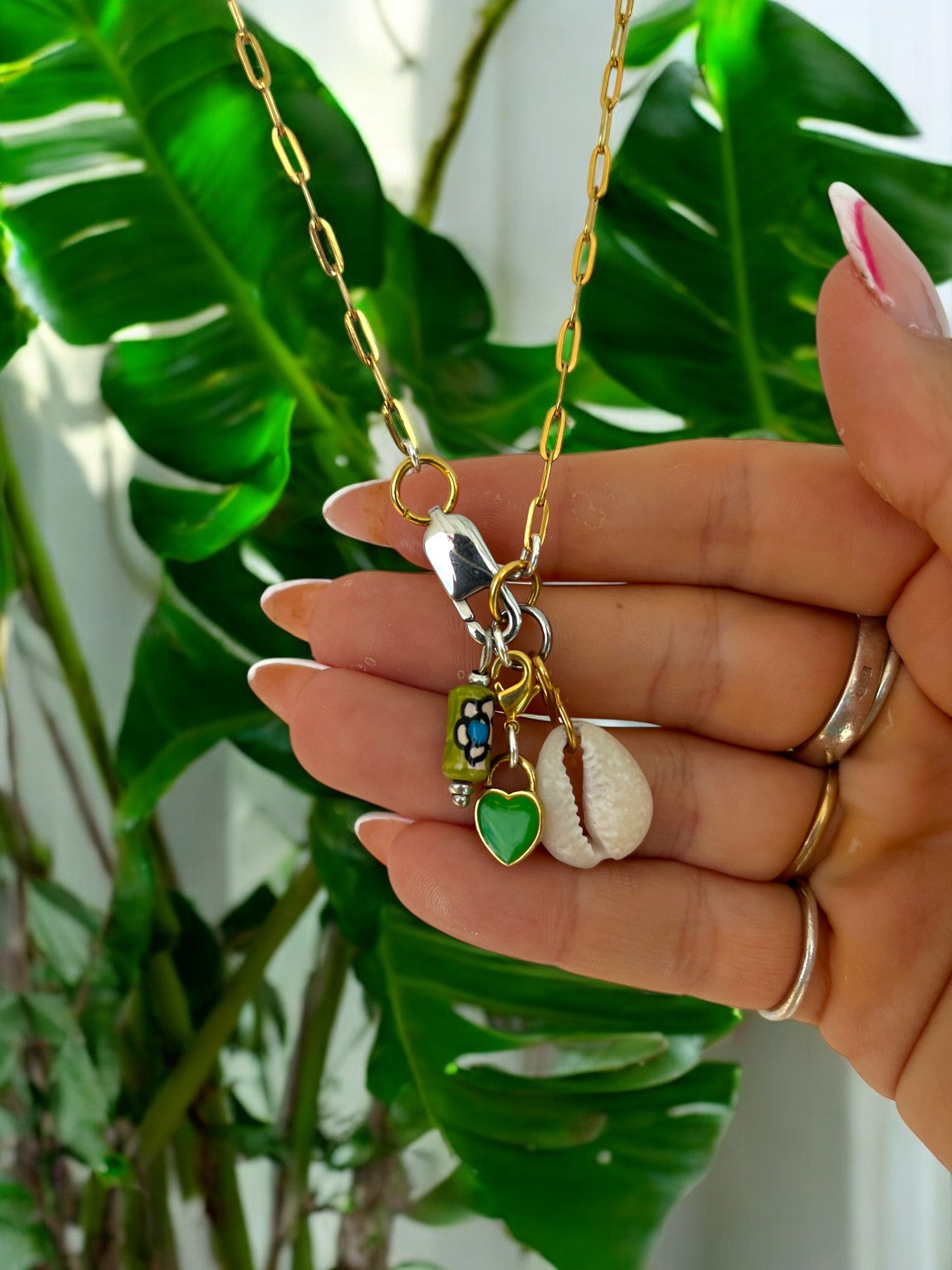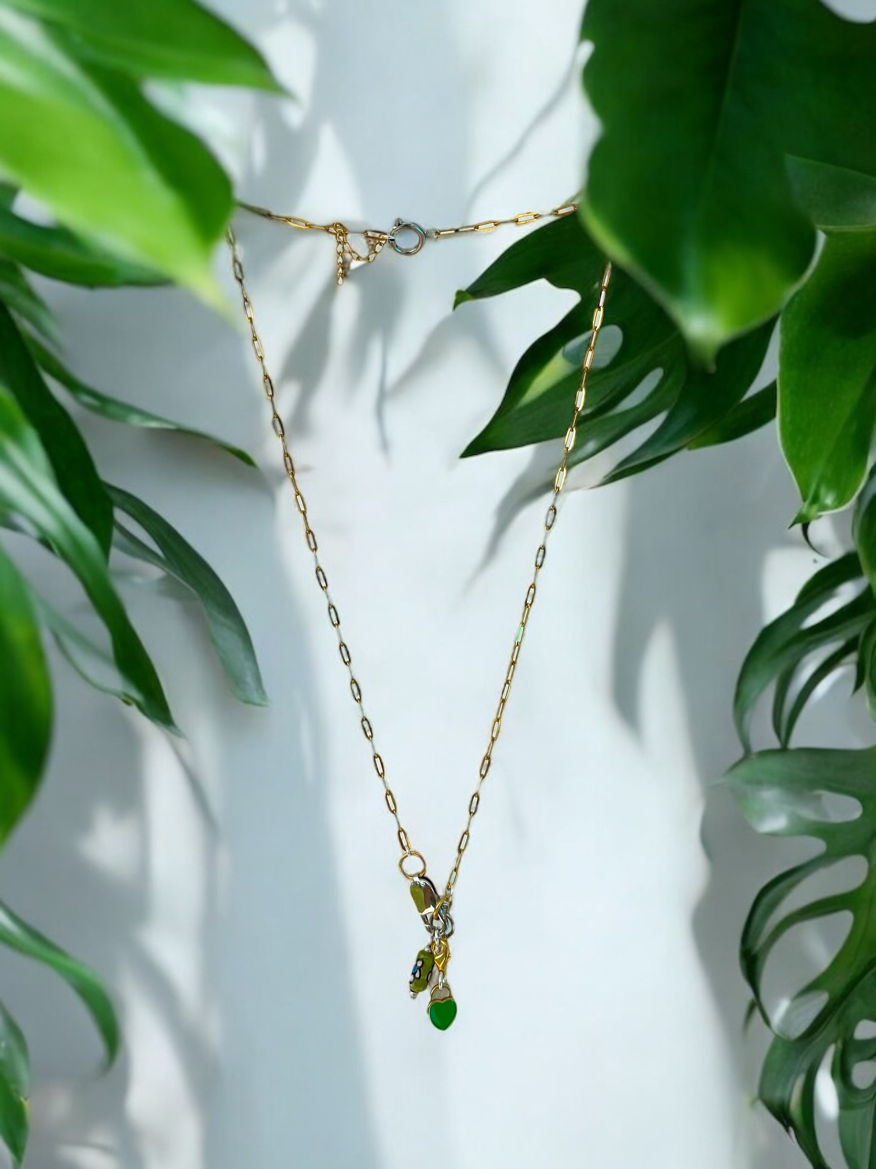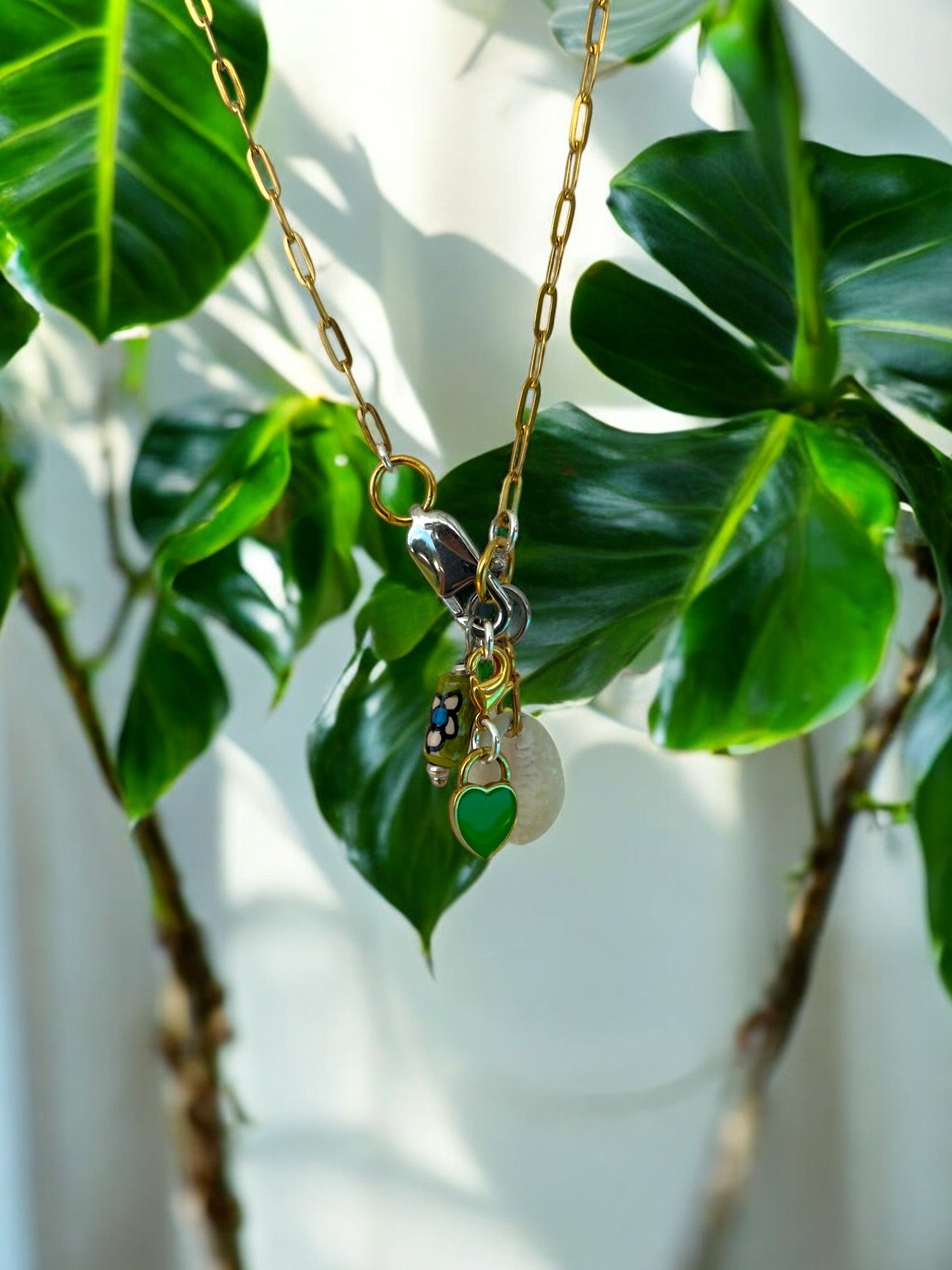 This necklace brings that same vibe. The green heart, the soft shell, and the mini bottle charm are all little nods to island life — light, fun, and a bit playful. It’s a feel-good piece that you can throw on with a bright top, a beachy dress, or anything flowy.