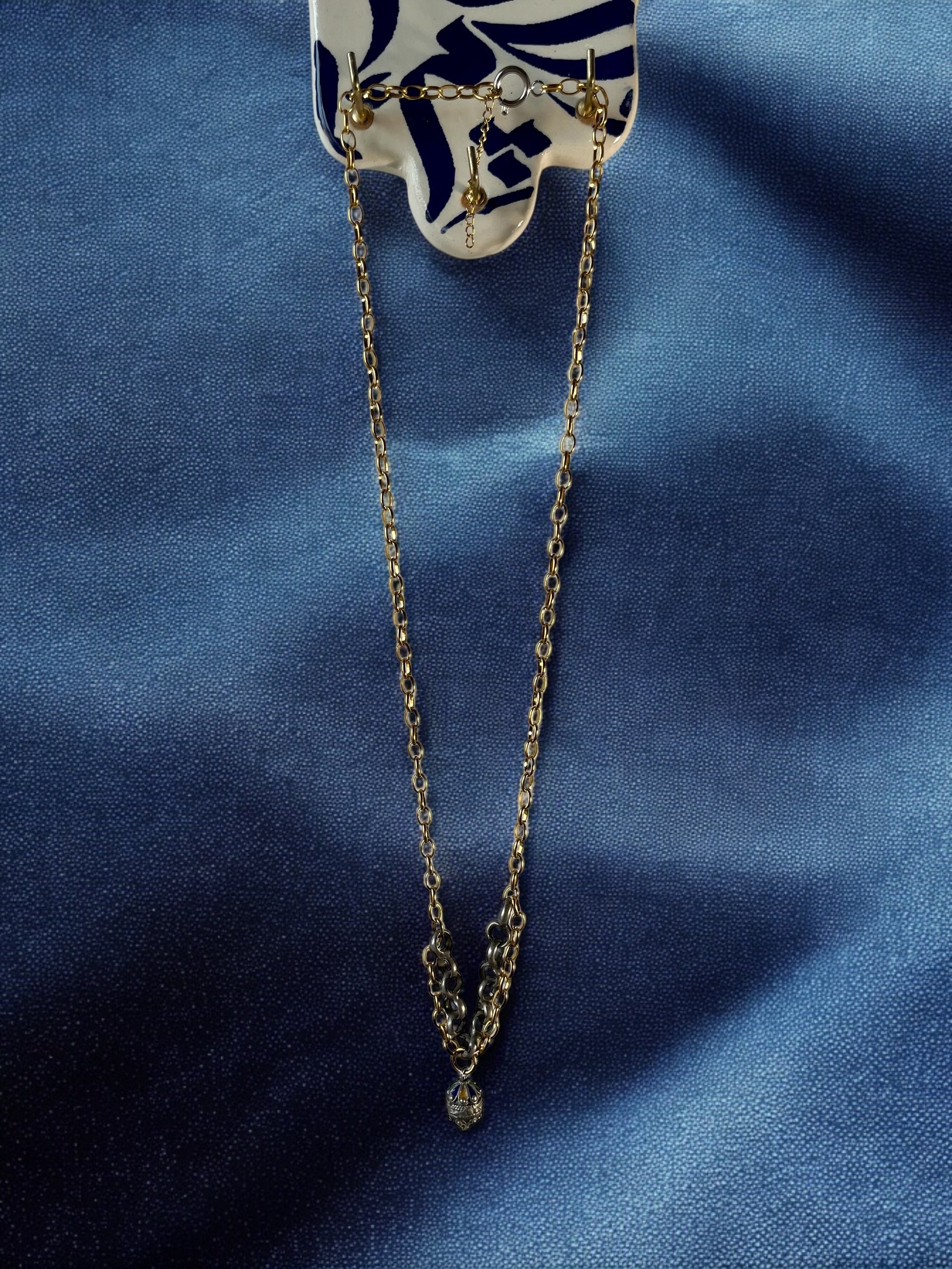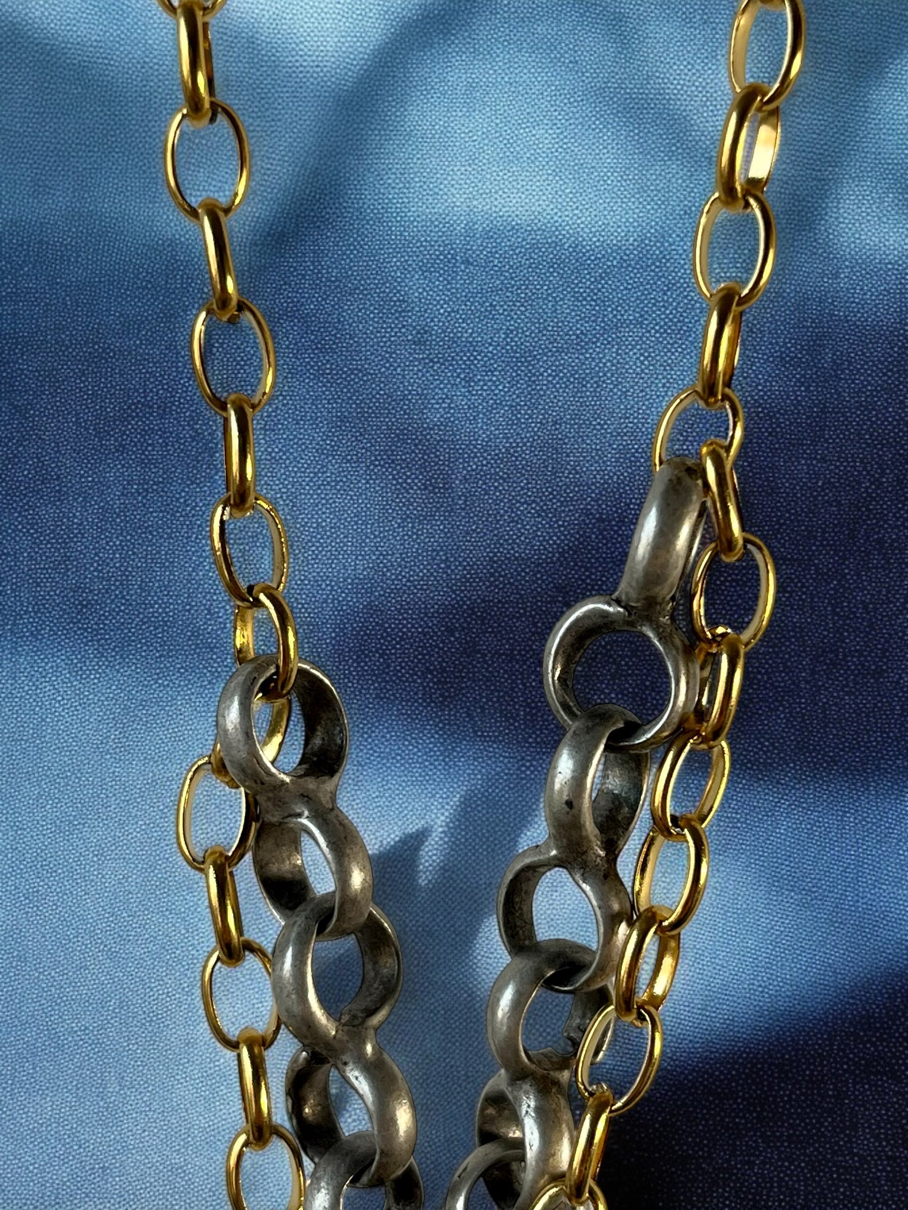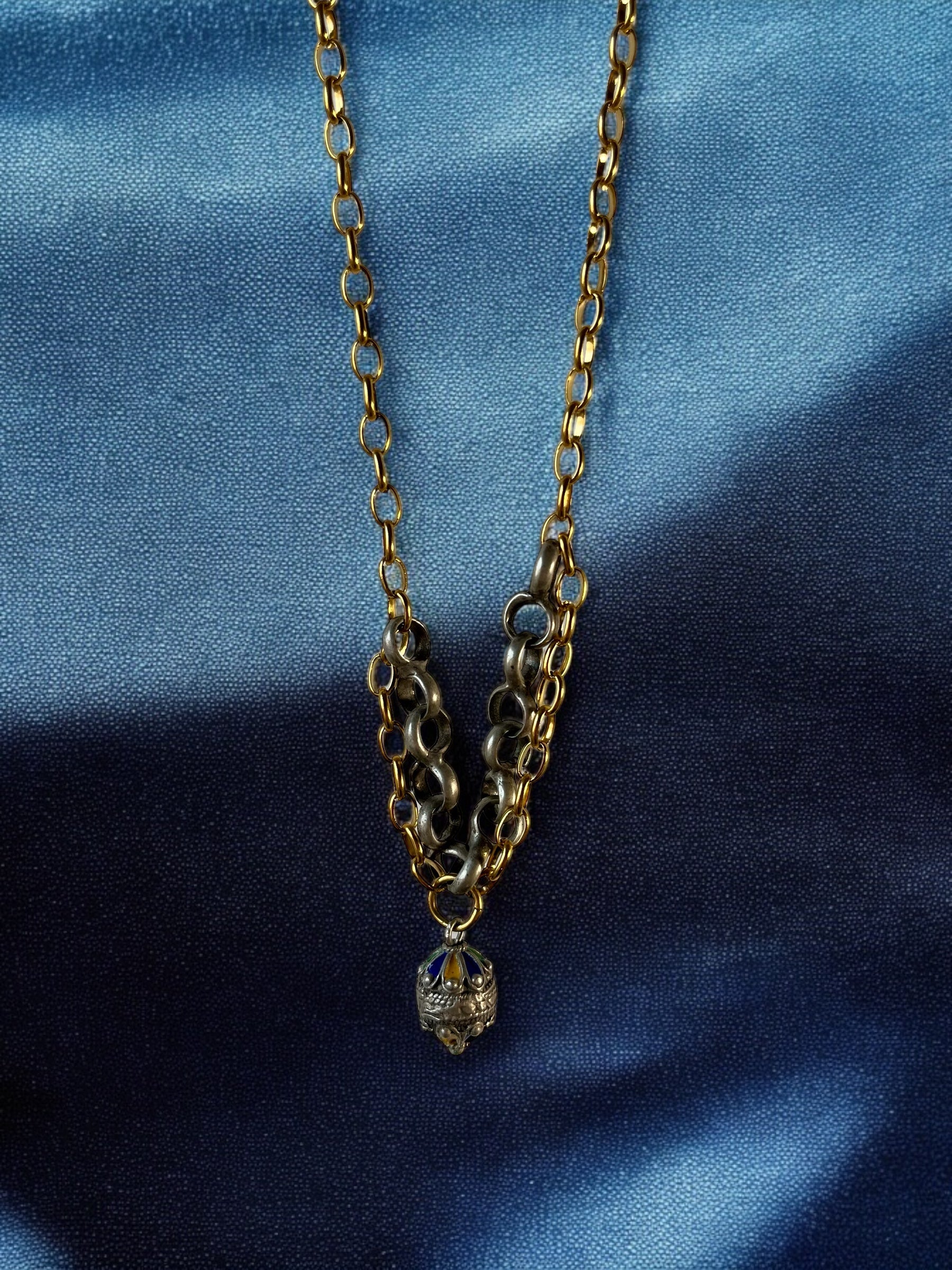 This necklace features a medium-sized thick gold chain, paired with a vibrant, detailed Silver Pendant. Originally designed as an earring, It has been thoughtfully transformed into a unique Pendant for this chain. Adding to its charm, the pendant is secured by a chunky Tunisian-style vintage silver chain, giving it an authentic, timeless appeal.