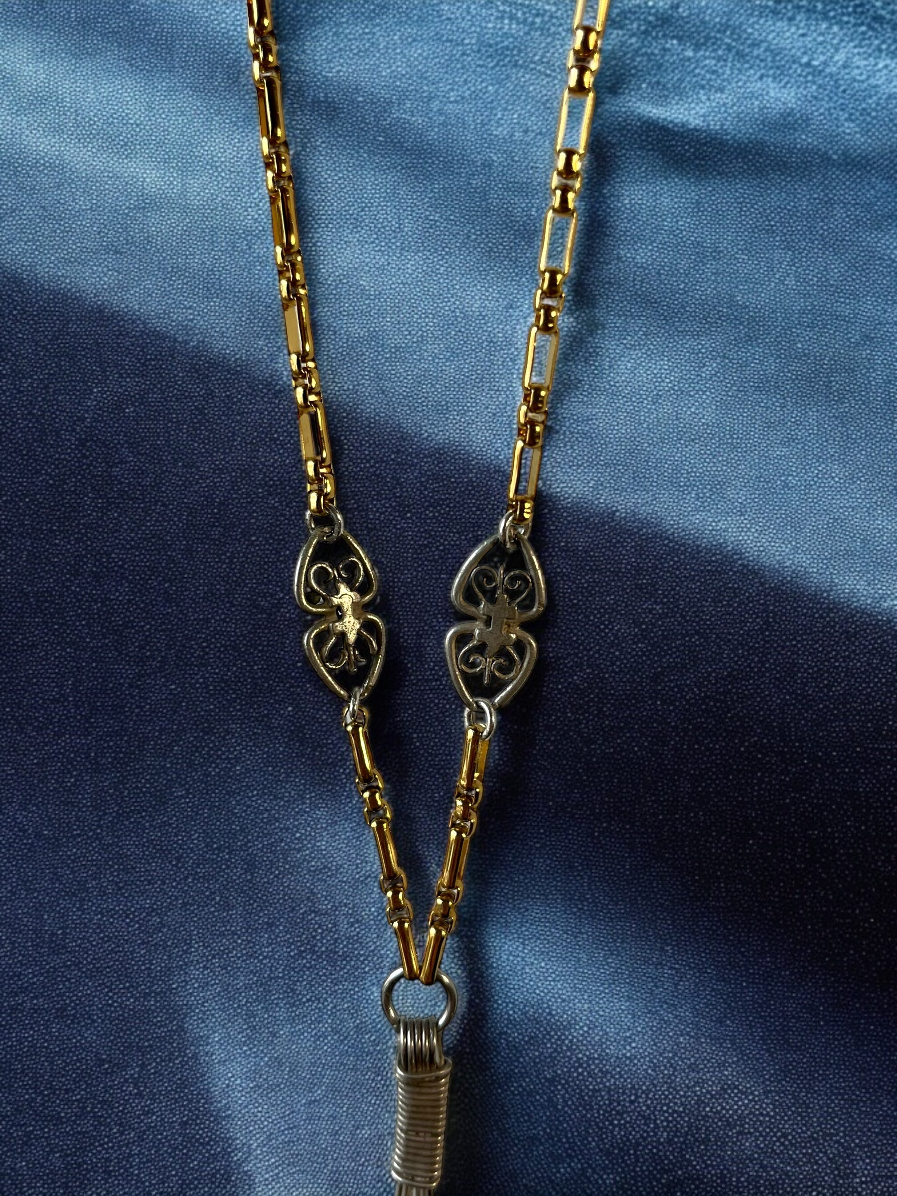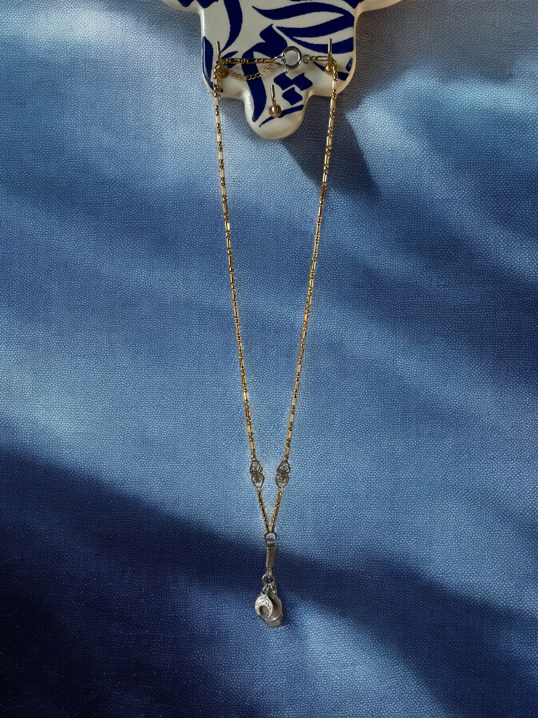 This mid-length necklace features a gold stainless steel chain with two intricately detailed charms, one on each side. Embracing a charm-style design, it showcases three unique pendants suspended together: