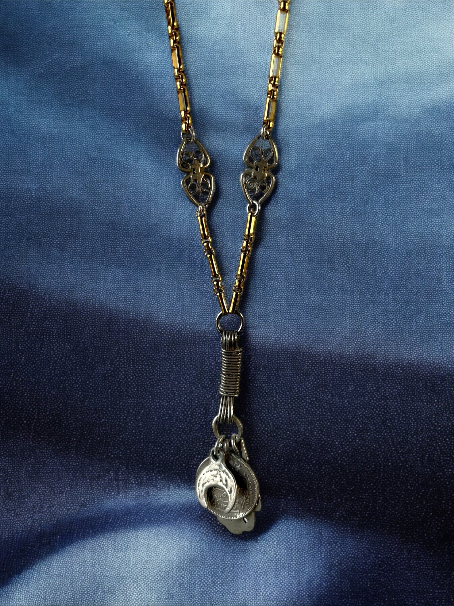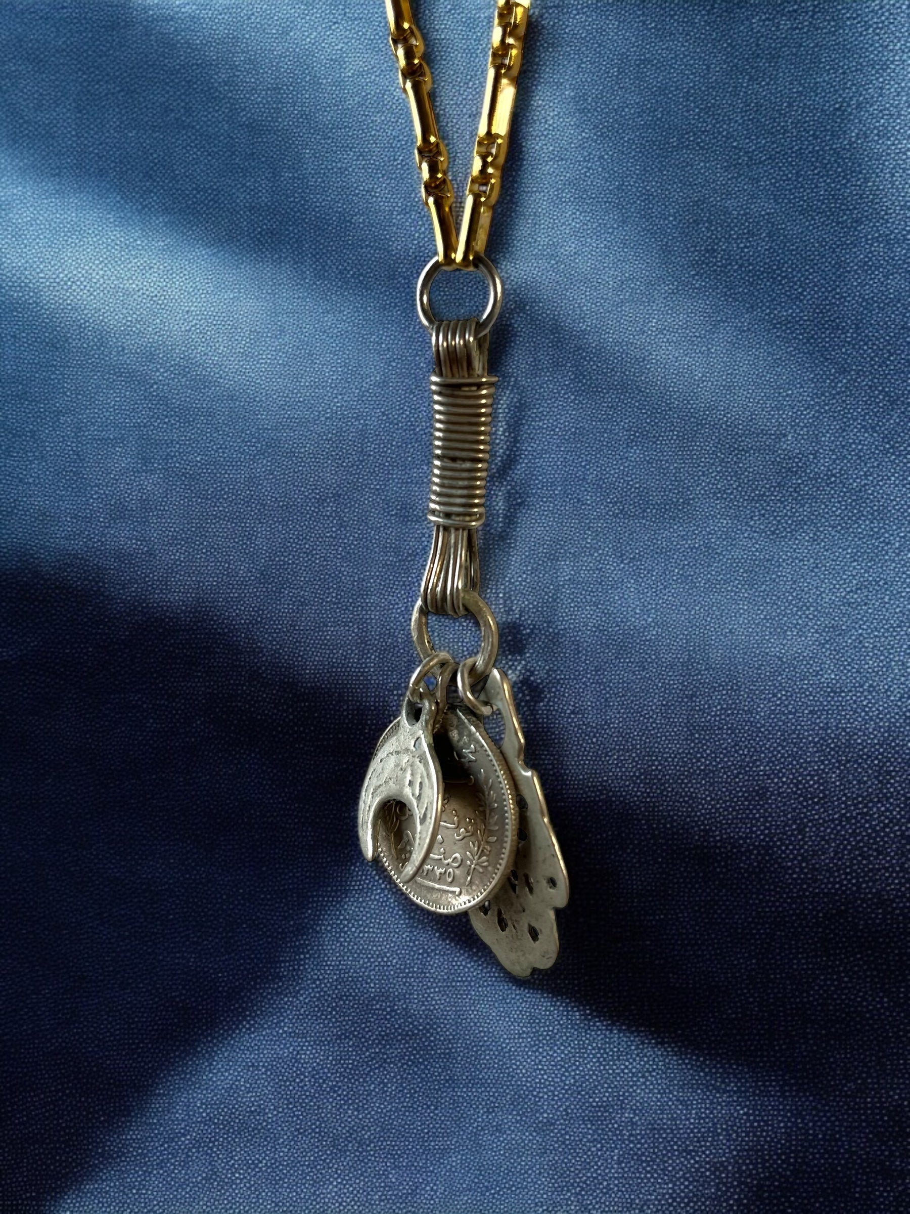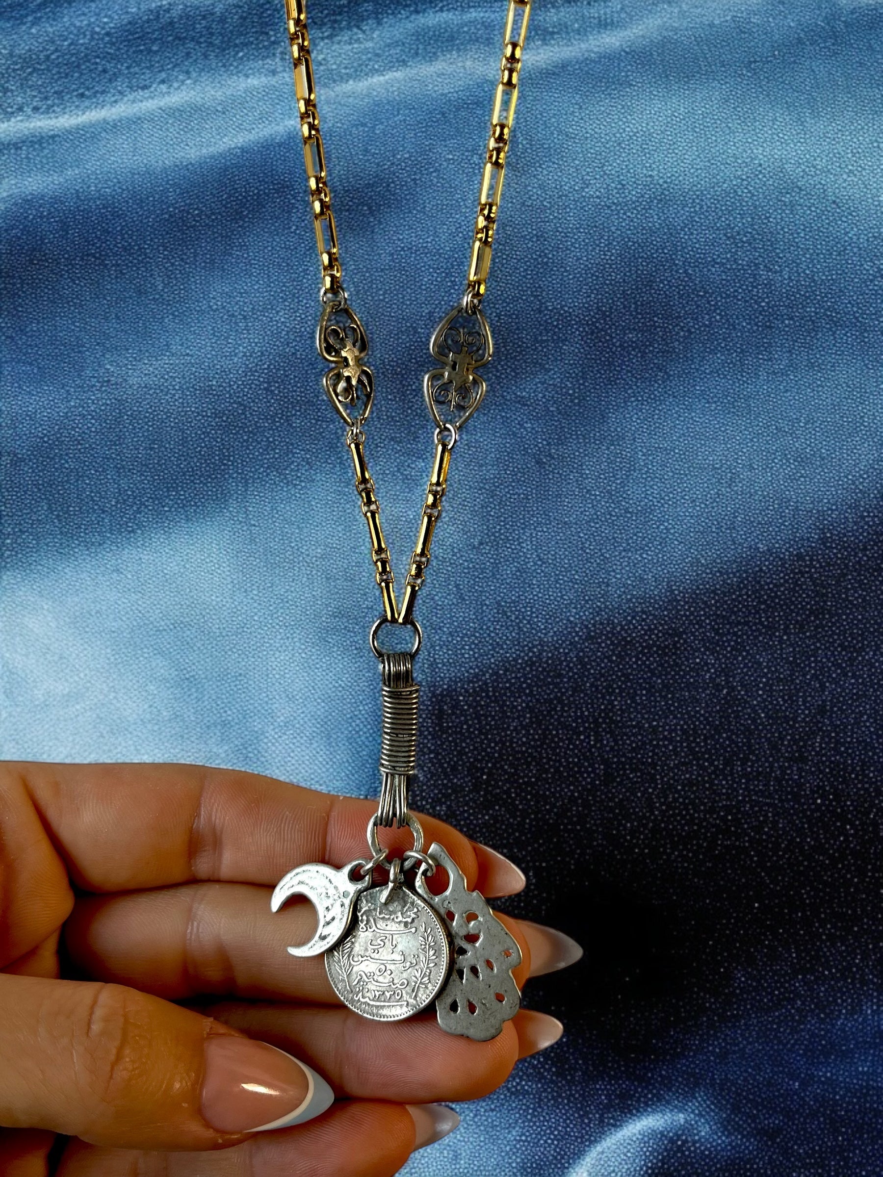 A crescent flag of Tunisia, A vintage Tunisian coin,The Hand of Fatima a symbol believed to provide protection against the evil eye and bring its owner happiness, luck, health, and good fortune. All these pendants are elegantly secured by a piece of silver wire surrounding itself, adding a touch of sophistication to the design.